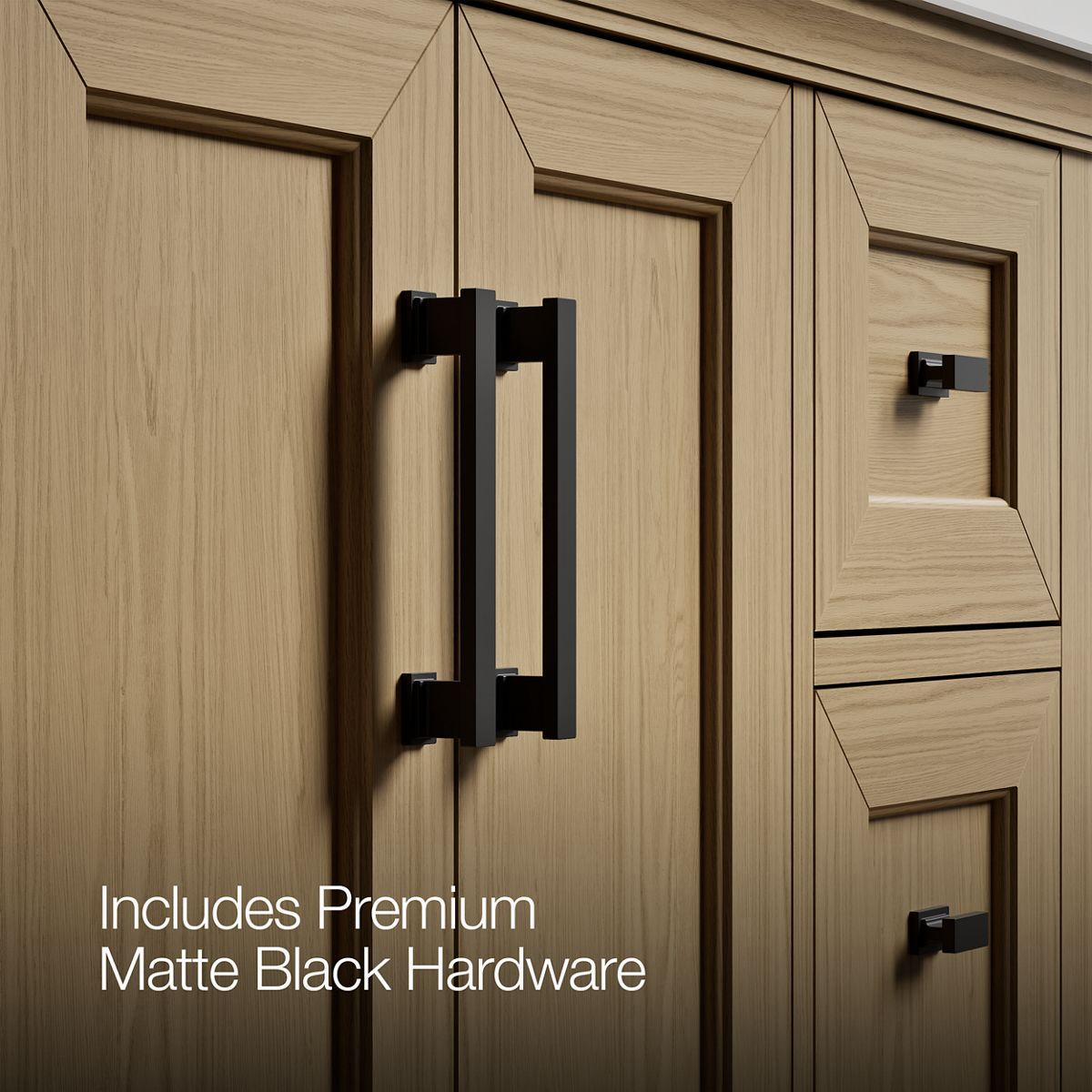 - Vibrant® Brushed Nickel hardware included on White vanities, Vibrant Brushed Moderne Brass hardware on Ferrous Grey and Tidal Blue vanities, and Matte Black hardware on Light Oak vanities
