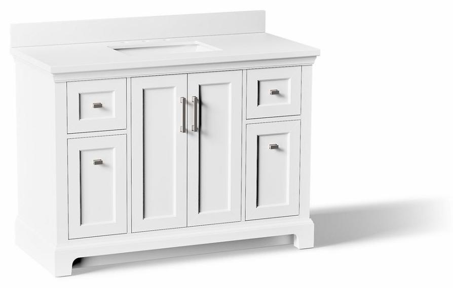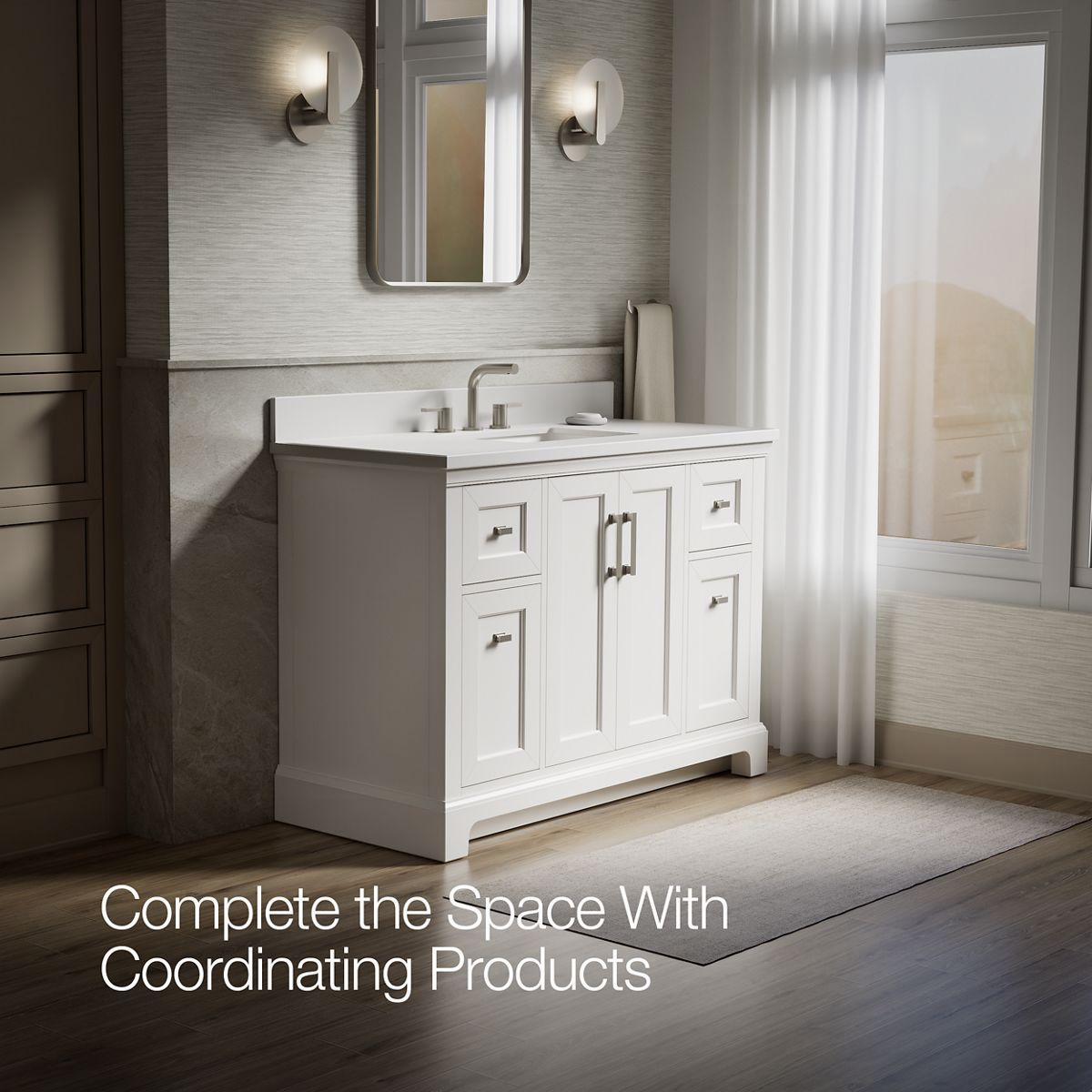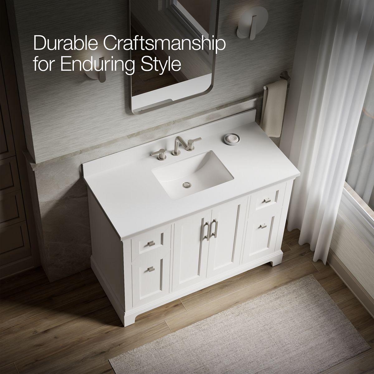 Inspired by midcentury modern design, the Charlemont vanity collection is adorned with elegant lines, subtle textures, and minimalist simplicity, bridging the gap between commonplace and niche. Raised-center door and drawer panels add visual interest, along with sharply squared hardware pulls featuring subtle details. This 48" vanity set includes cabinet, quartz countertop with matching backsplash, sink, and hardware.