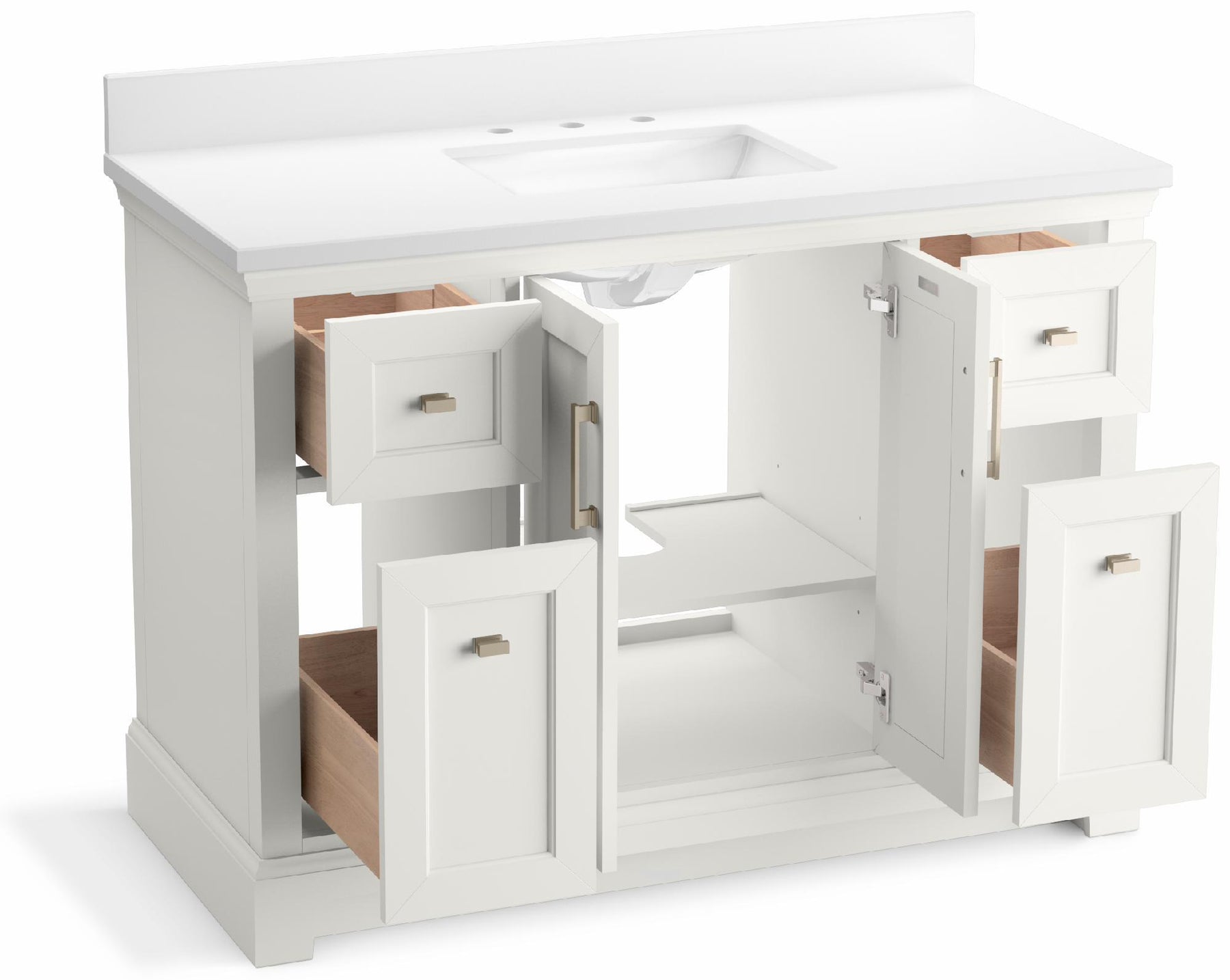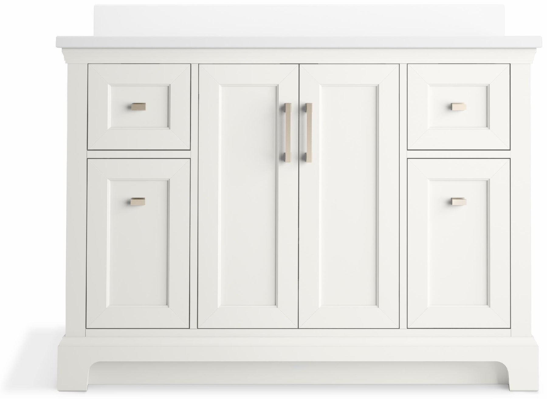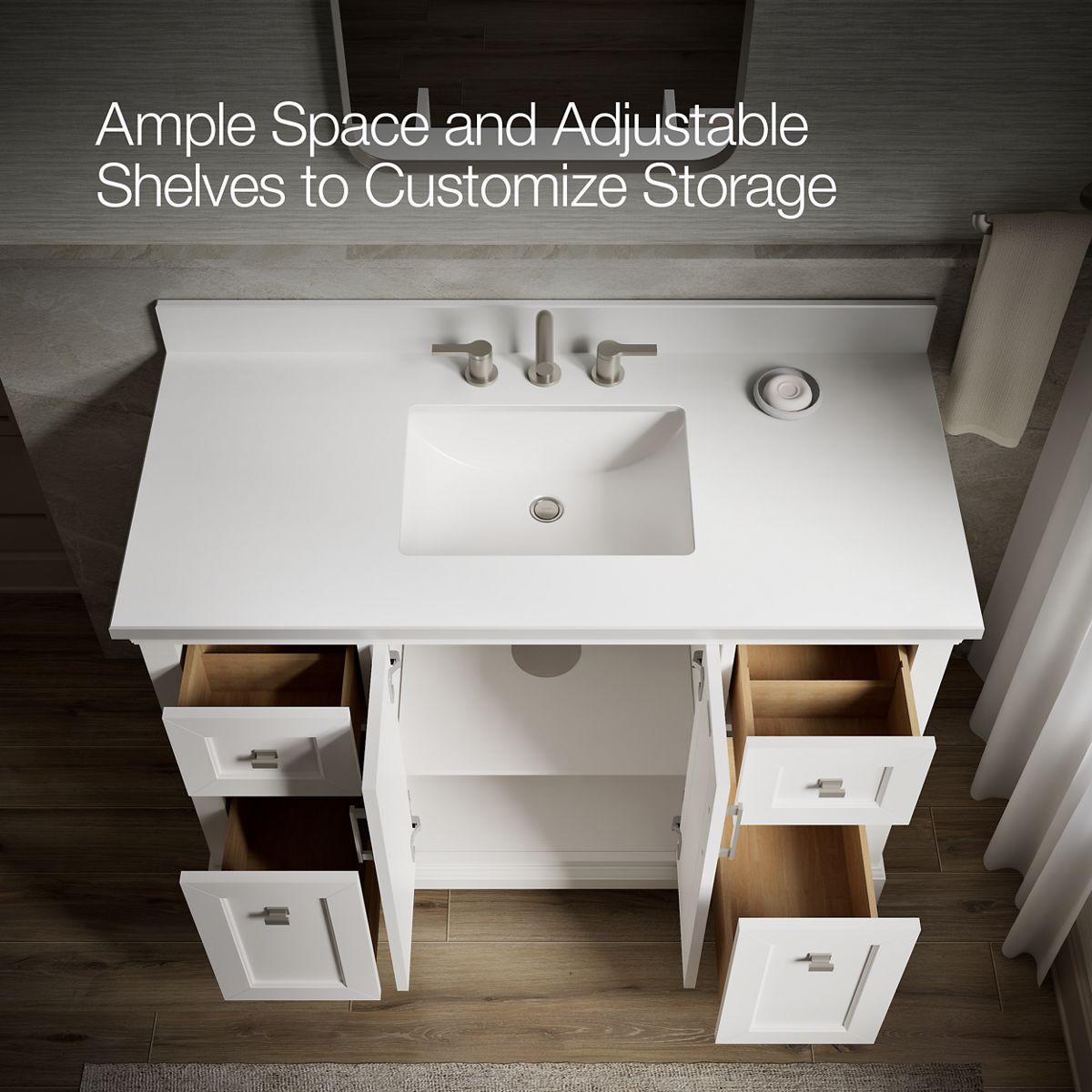 Inspired by midcentury modern design, the Charlemont vanity collection is adorned with elegant lines, subtle textures, and minimalist simplicity, bridging the gap between commonplace and niche. Raised-center door and drawer panels add visual interest, along with sharply squared hardware pulls featuring subtle details. This 48" vanity set includes cabinet, quartz countertop with matching backsplash, sink, and hardware.
