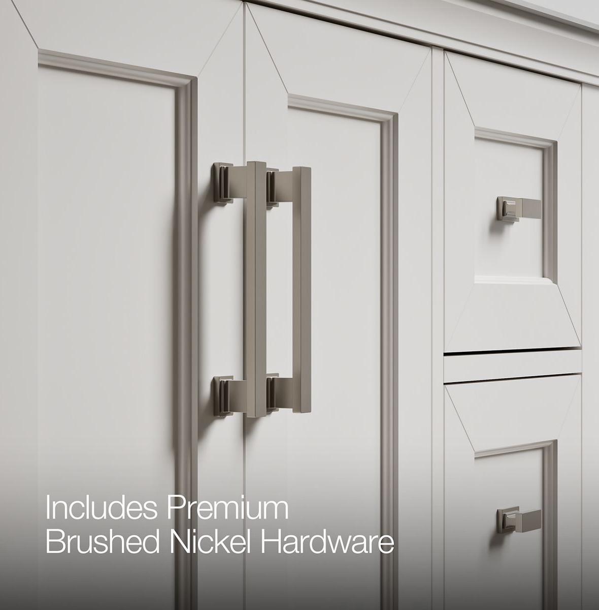 - Vibrant Brushed Nickel hardware included on White vanities, Vibrant Brushed Moderne Brass hardware on Ferrous Grey and Tidal Blue vanities, and Matte Black hardware on Light Oak vanities