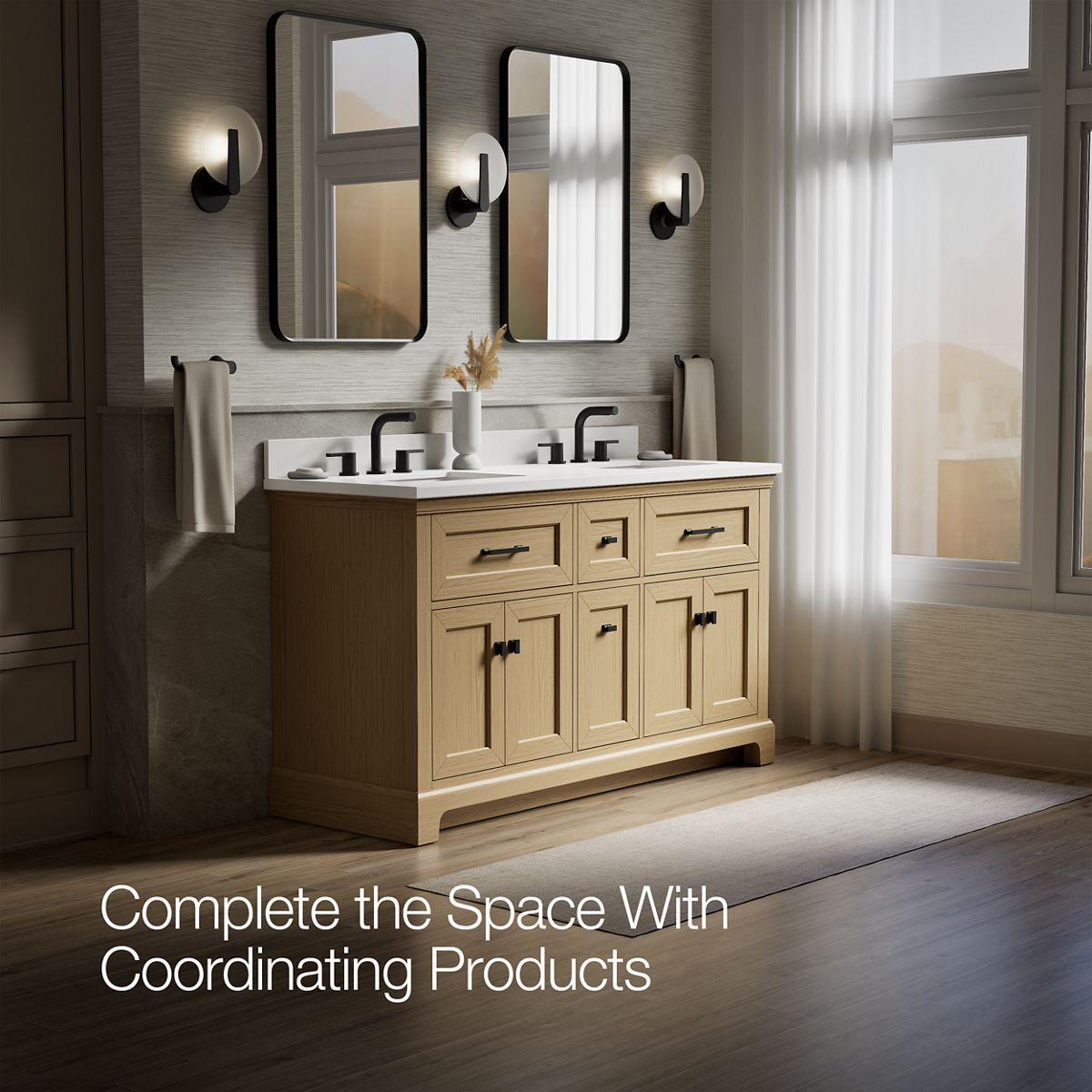 - Vibrant® Brushed Nickel hardware included on White vanities, Vibrant Brushed Moderne Brass hardware on Ferrous Grey and Tidal Blue vanities, and Matte Black hardware on Light Oak vanities