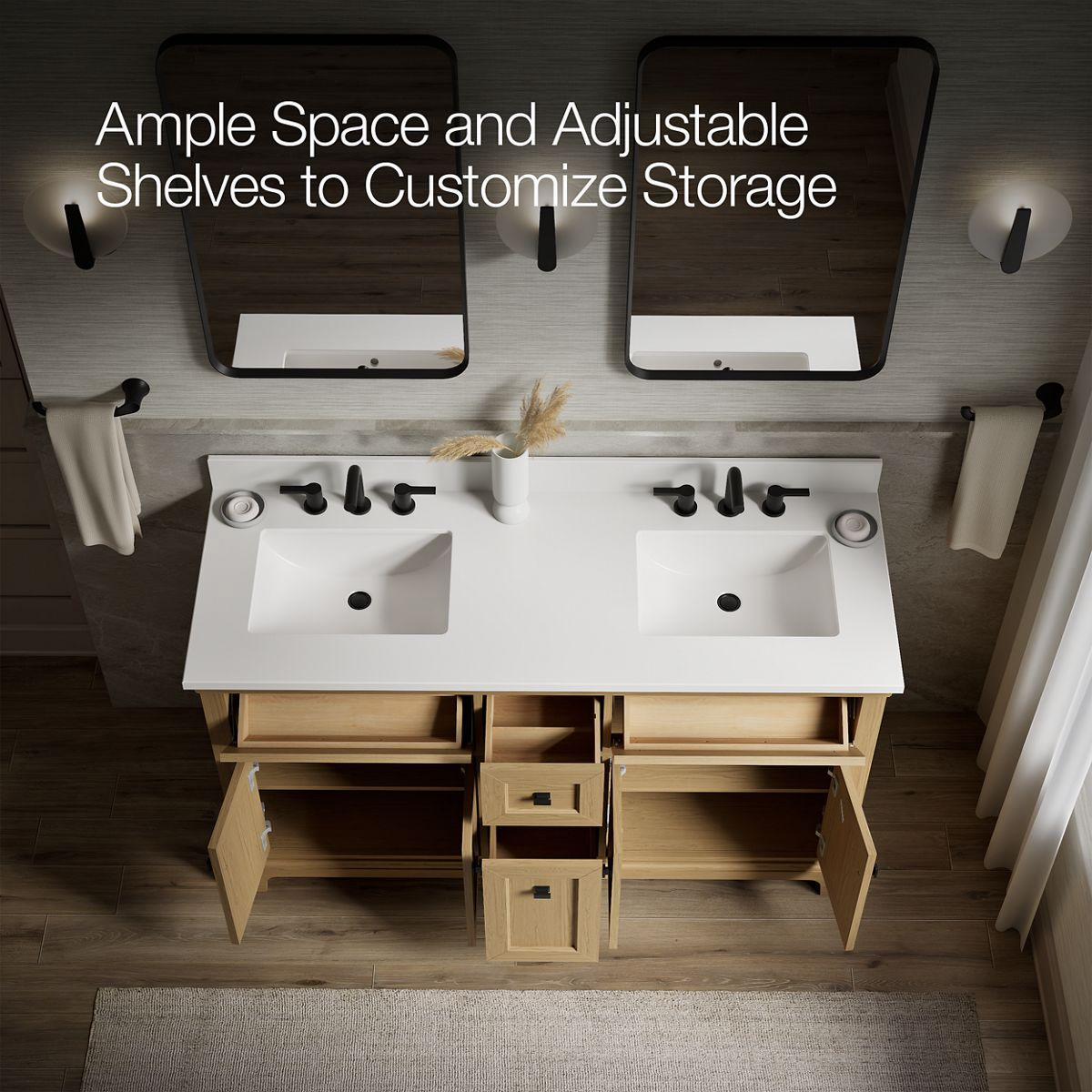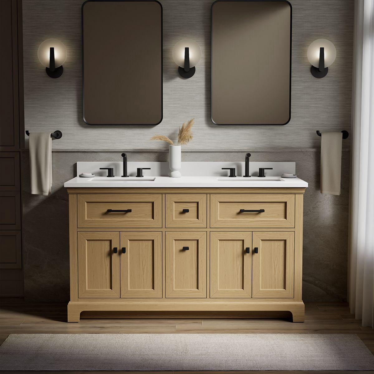 Inspired by midcentury modern design, the Charlemont vanity collection is adorned with elegant lines, subtle textures, and minimalist simplicity, bridging the gap between commonplace and niche. Raised-center door and drawer panels add visual interest, along with sharply squared hardware pulls featuring subtle details. This 60" vanity set includes cabinet, quartz countertop with matching backsplash, two sinks, and hardware.