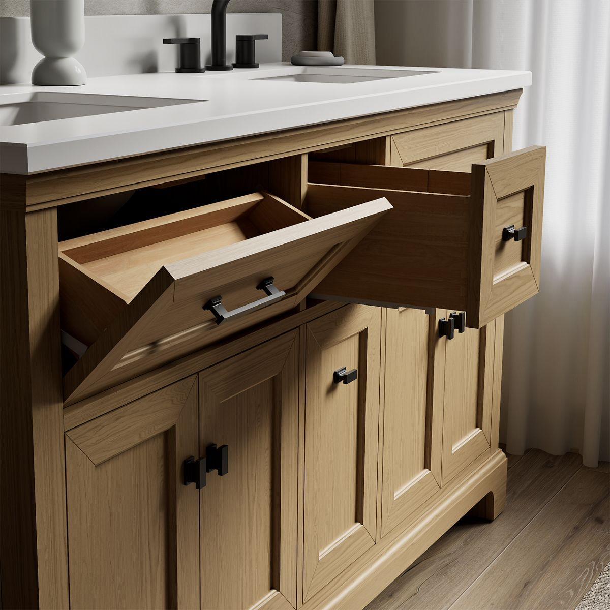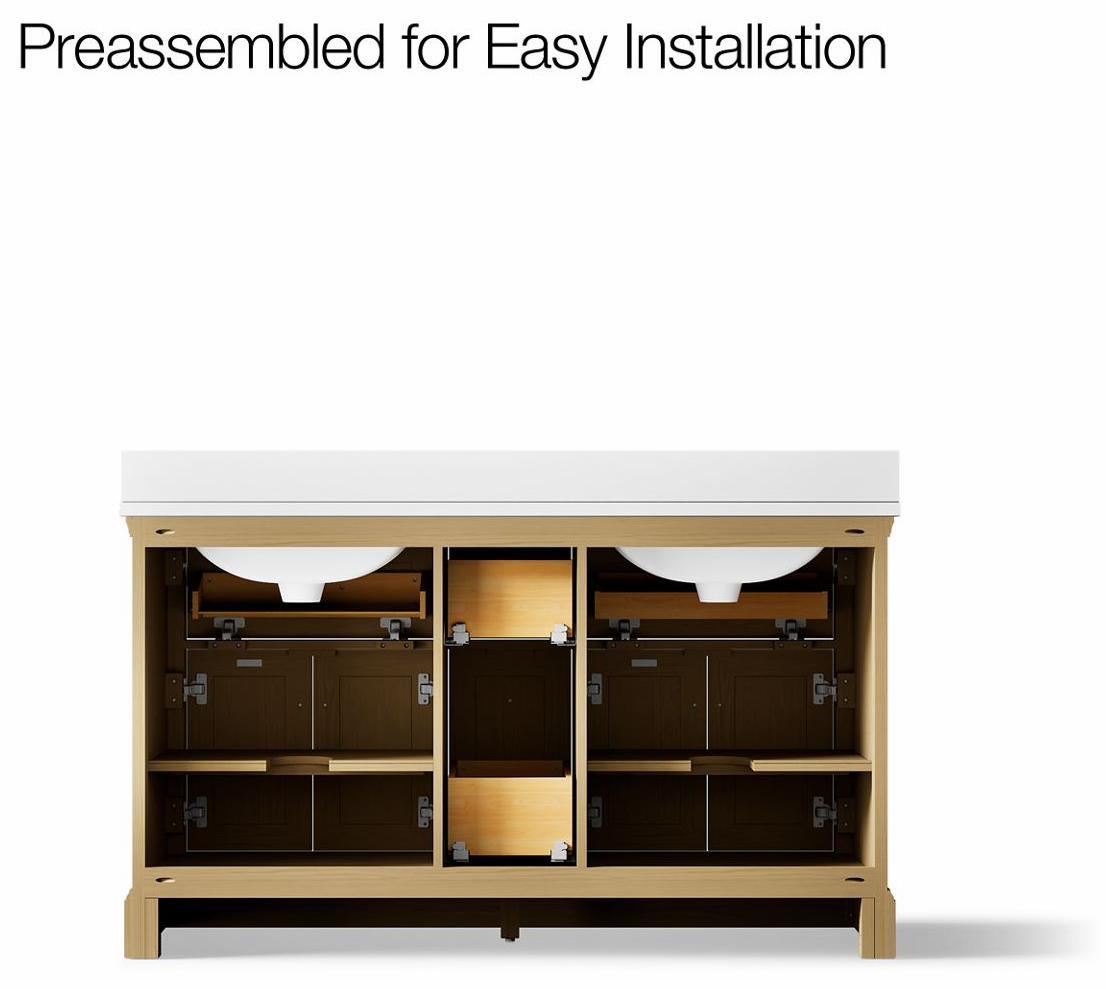 - Set includes cabinet, precut quartz vanity top, backsplash, sinks, cabinet hardware