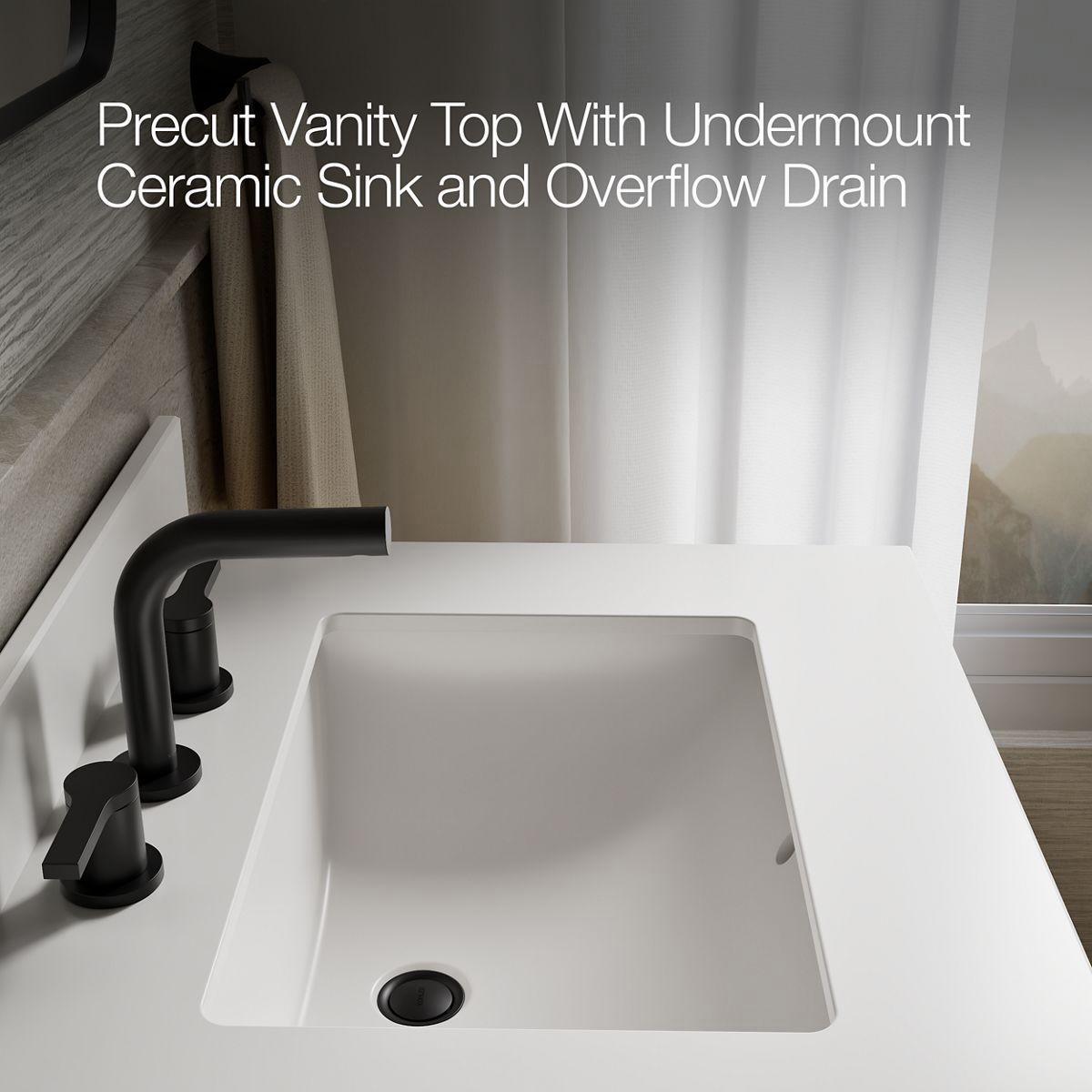- Set includes cabinet, precut quartz vanity top, backsplash, sink, cabinet hardware