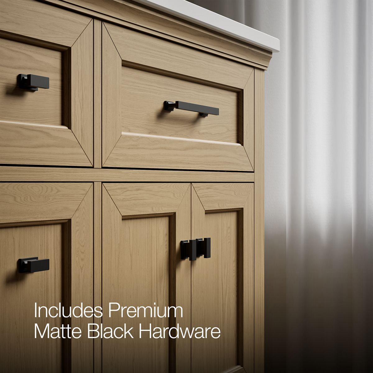 - Vibrant Brushed Nickel hardware included on White vanities, Vibrant Brushed Moderne Brass hardware on Ferrous Grey and Tidal Blue vanities, and Matte Black hardware on Light Oak vanities