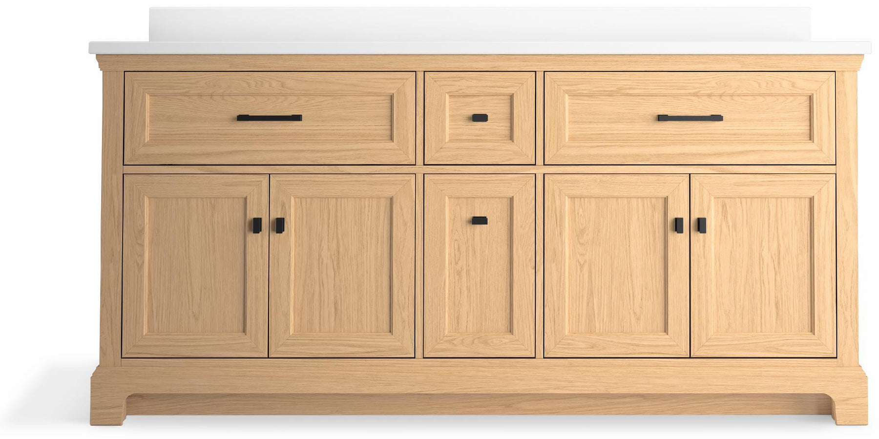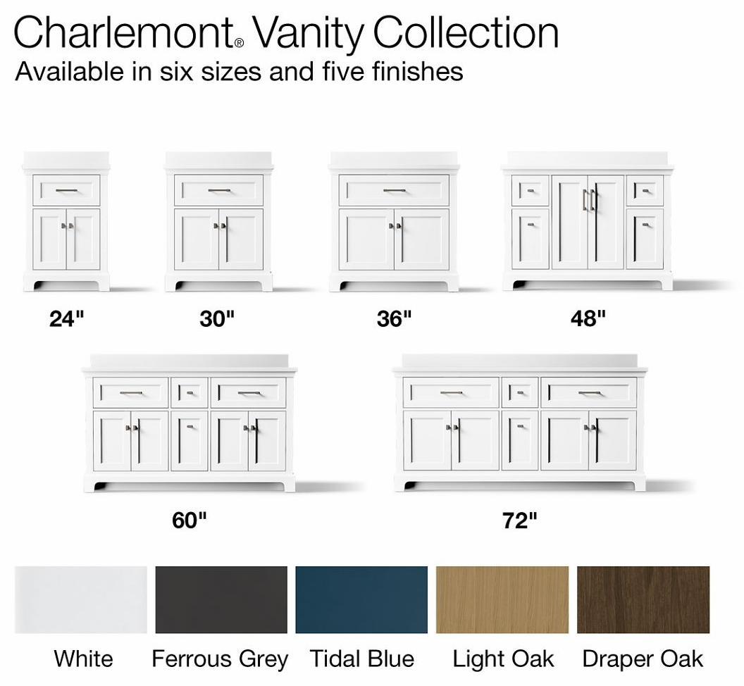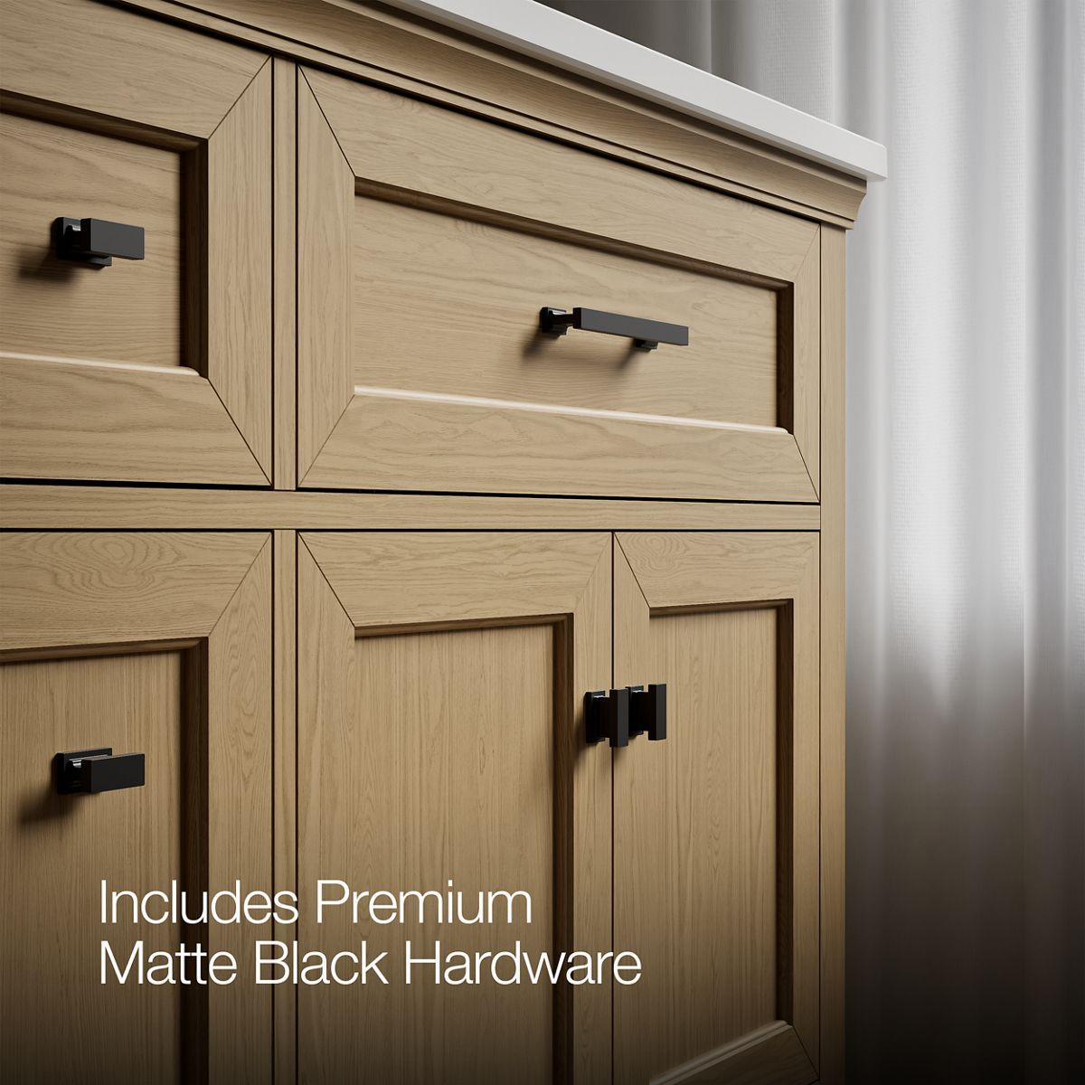 - Vibrant® Brushed Nickel hardware included on White vanities, Vibrant Brushed Moderne Brass hardware on Ferrous Grey and Tidal Blue vanities, and Matte Black hardware on Light Oak vanities