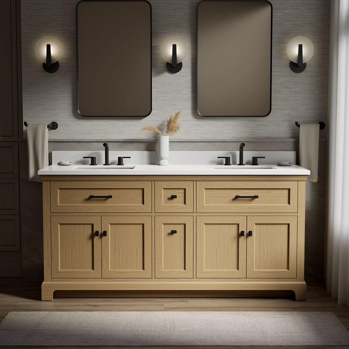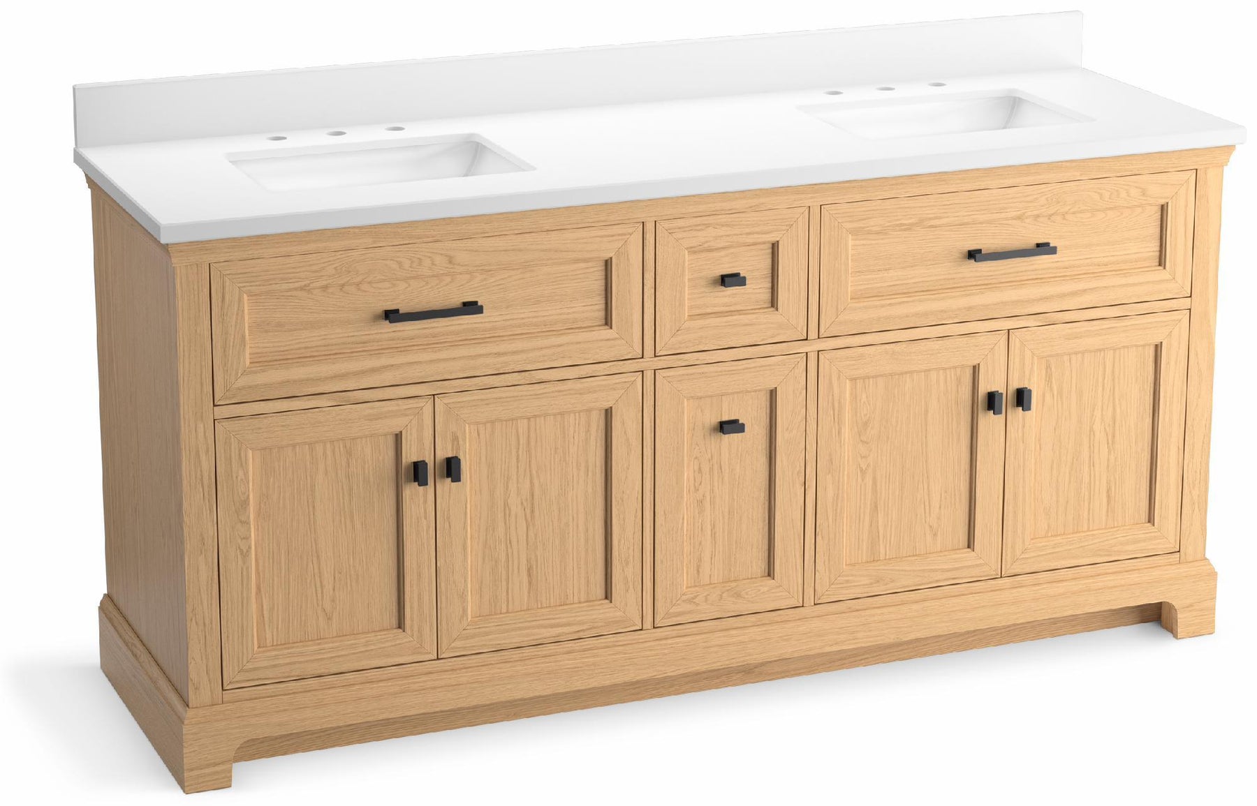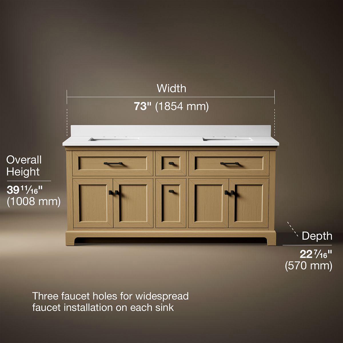 - Set includes cabinet, precut quartz vanity top, backsplash, sinks, cabinet hardware