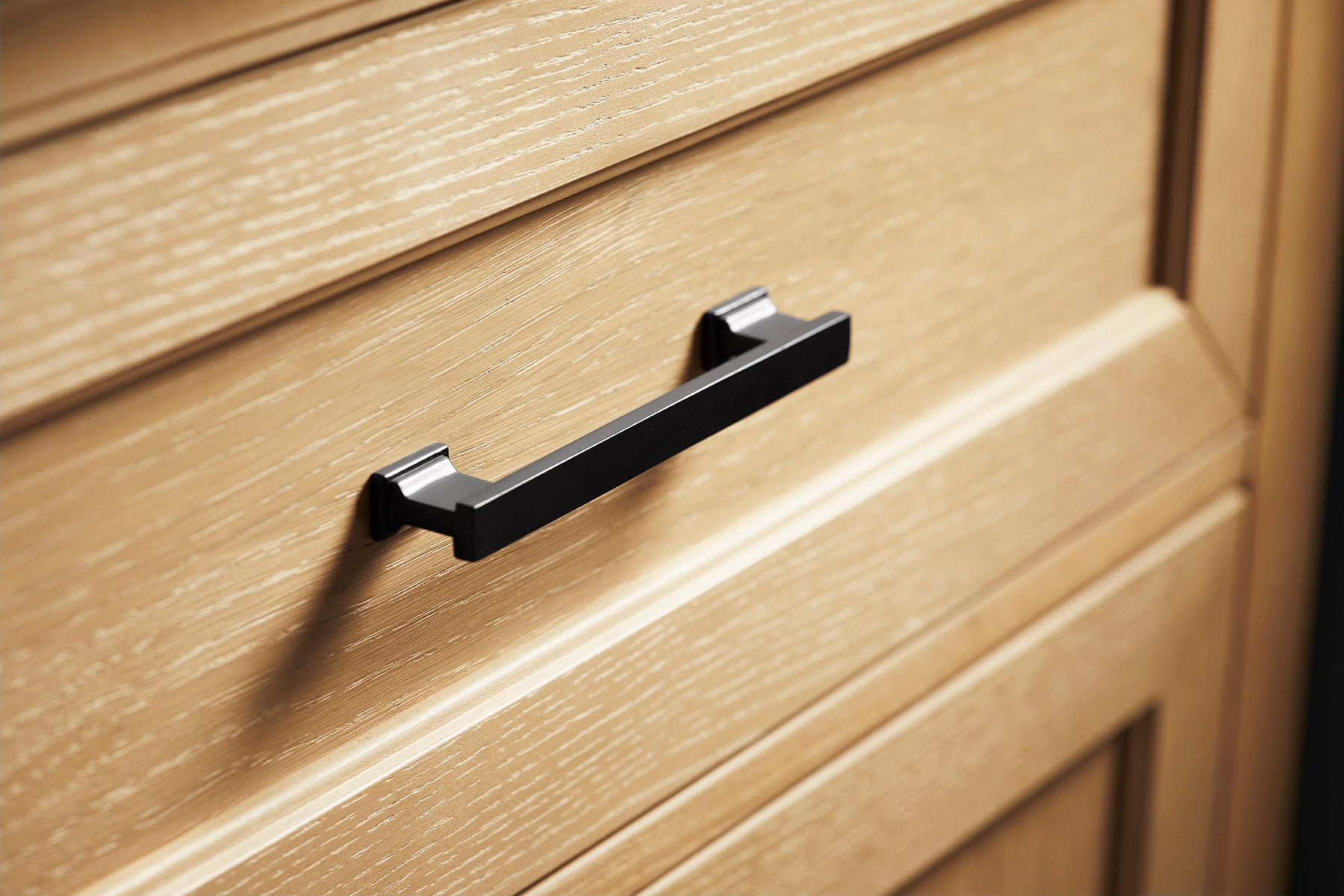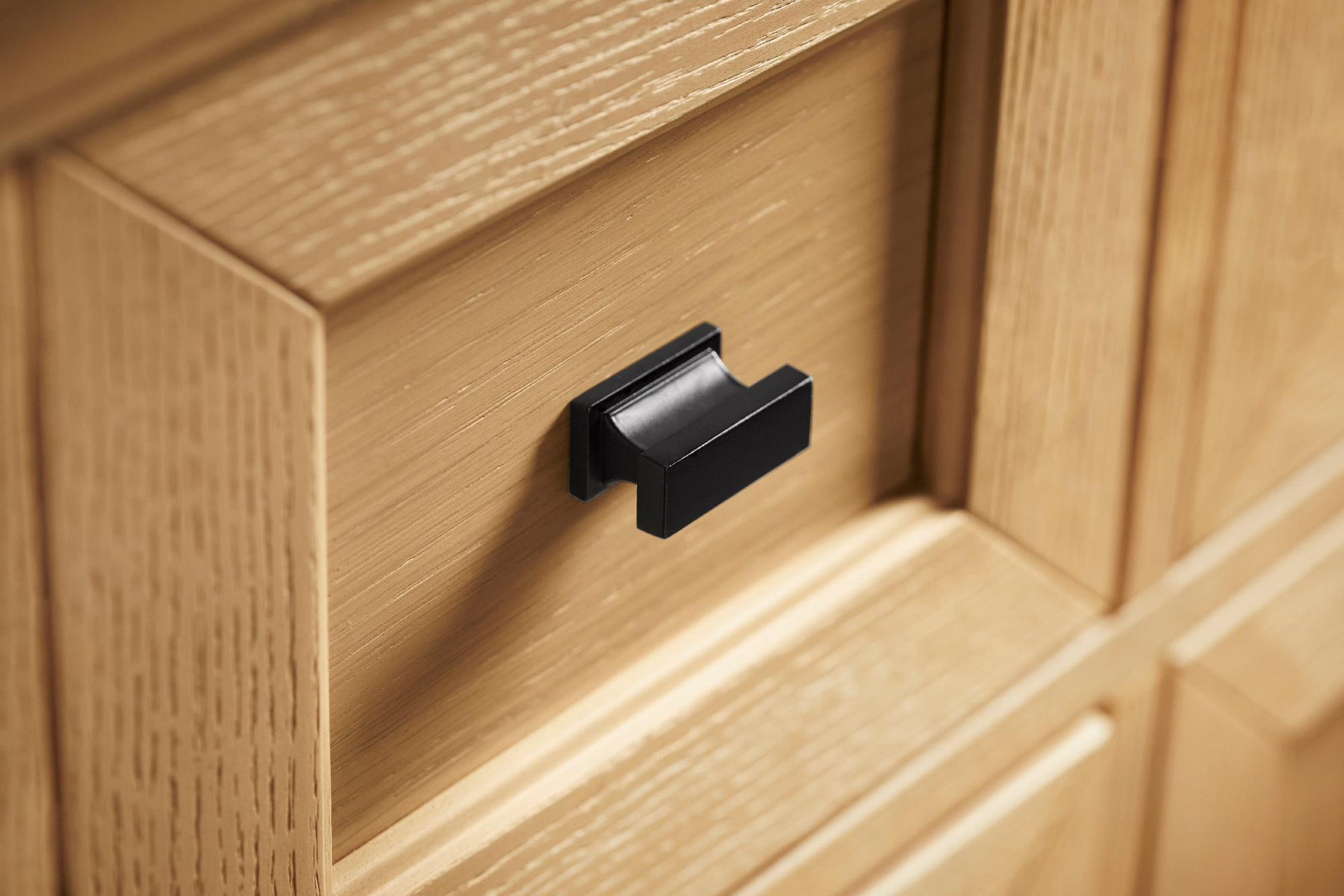 - Vibrant Brushed Nickel hardware included on White vanities, Vibrant Brushed Moderne Brass hardware on Ferrous Grey and Tidal Blue vanities, and Matte Black hardware on Light Oak vanities