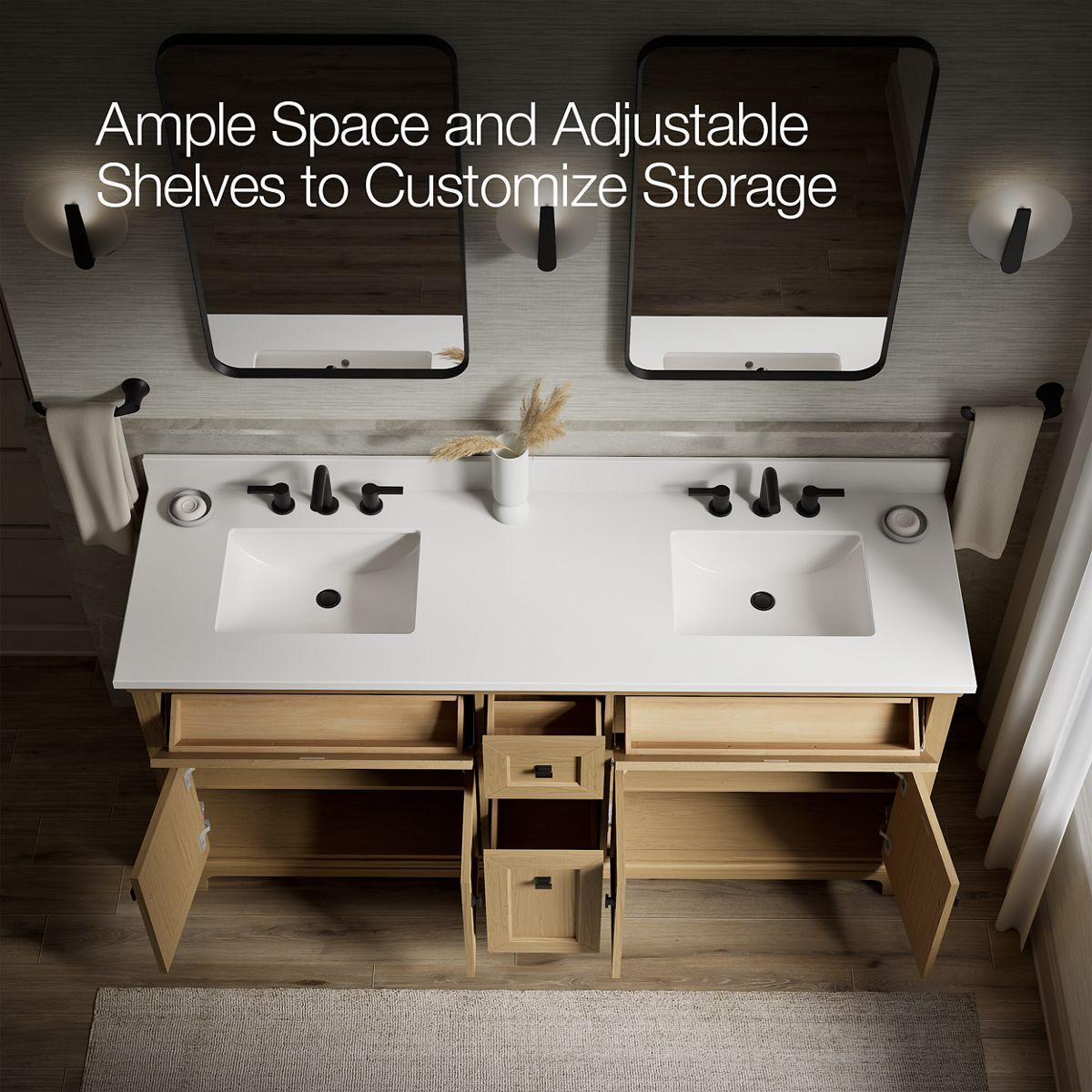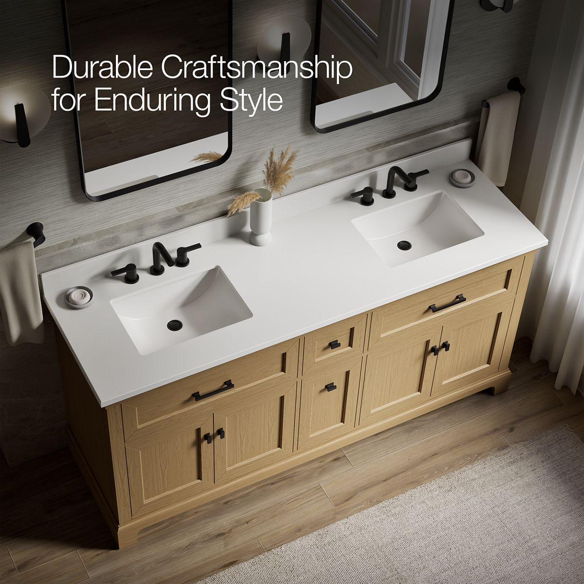 Inspired by midcentury modern design, the Charlemont vanity collection is adorned with elegant lines, subtle textures, and minimalist simplicity, bridging the gap between commonplace and niche. Raised-center door and drawer panels add visual interest, along with sharply squared hardware pulls featuring subtle details. This 72" vanity set includes cabinet, quartz countertop with matching backsplash, two sinks, and hardware.