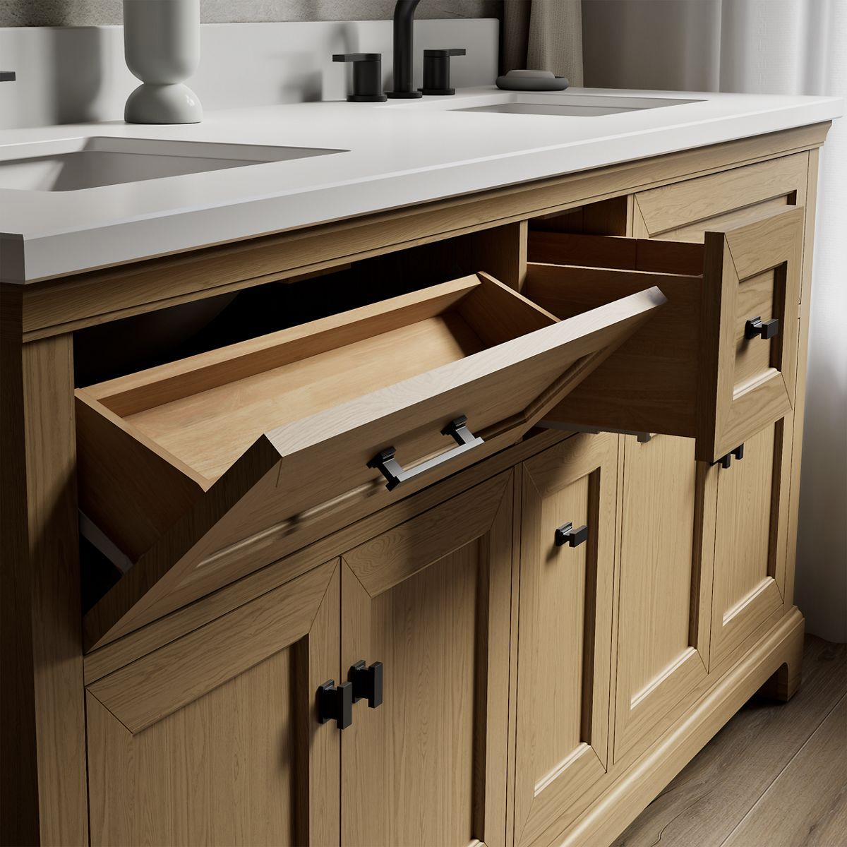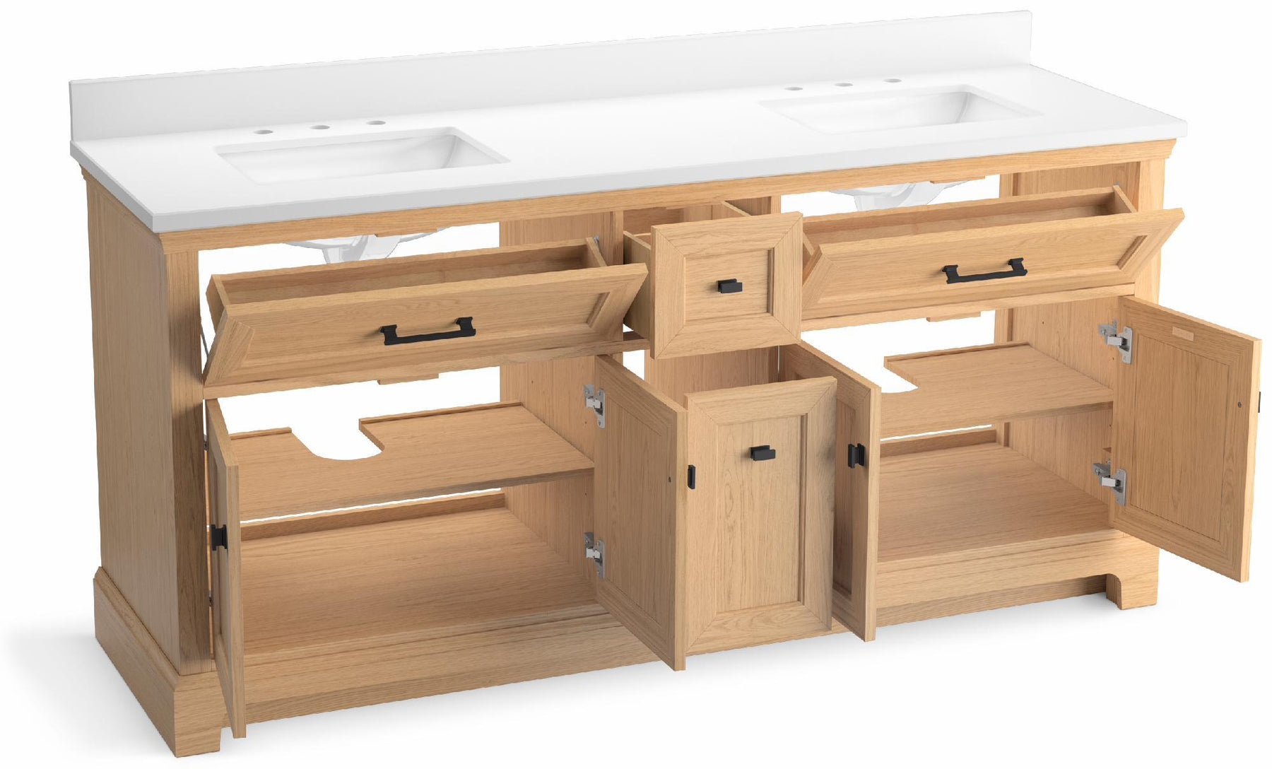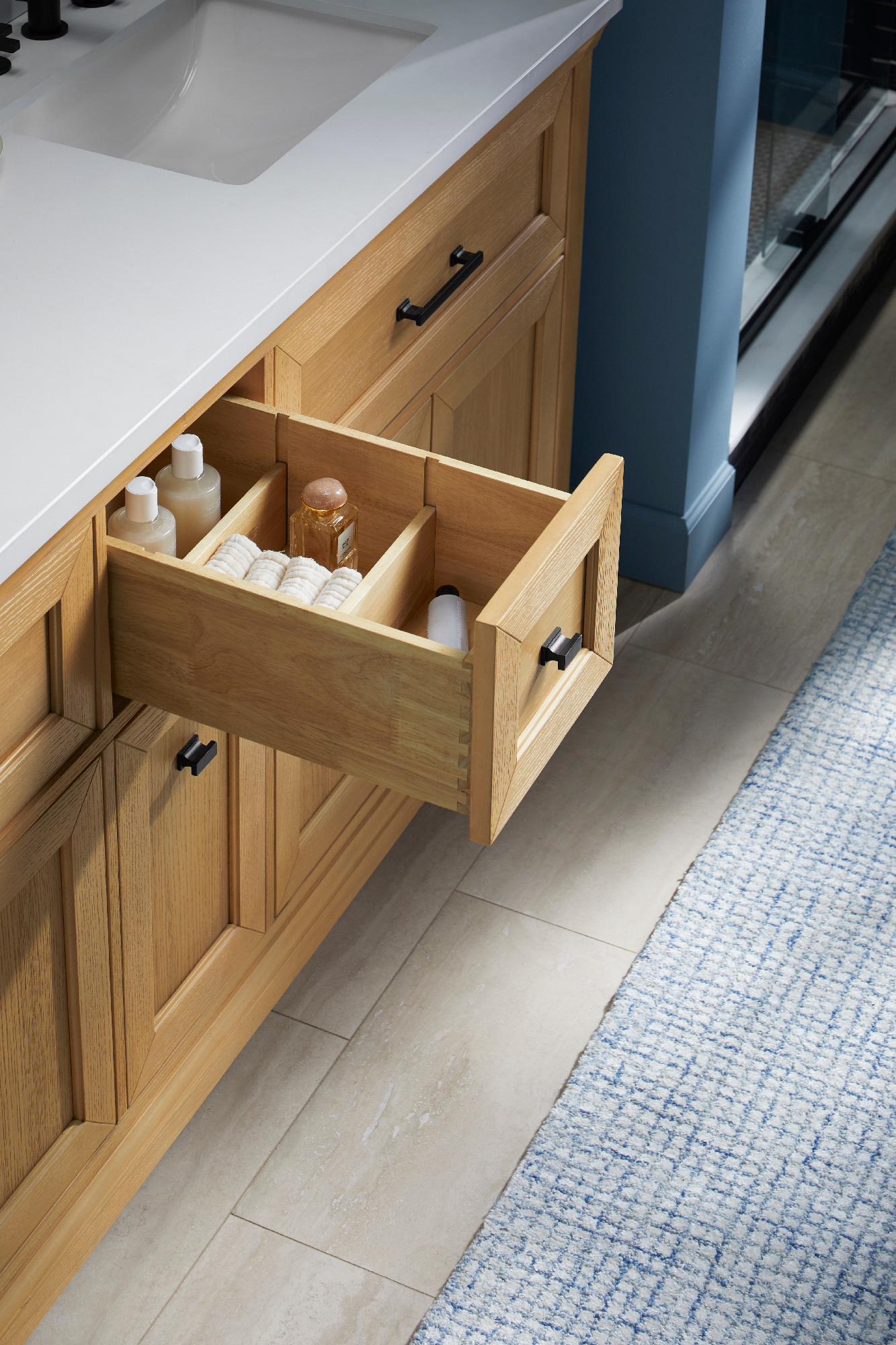 - Convenient tilt-down drawer under each basin for storing smaller, frequently-used items