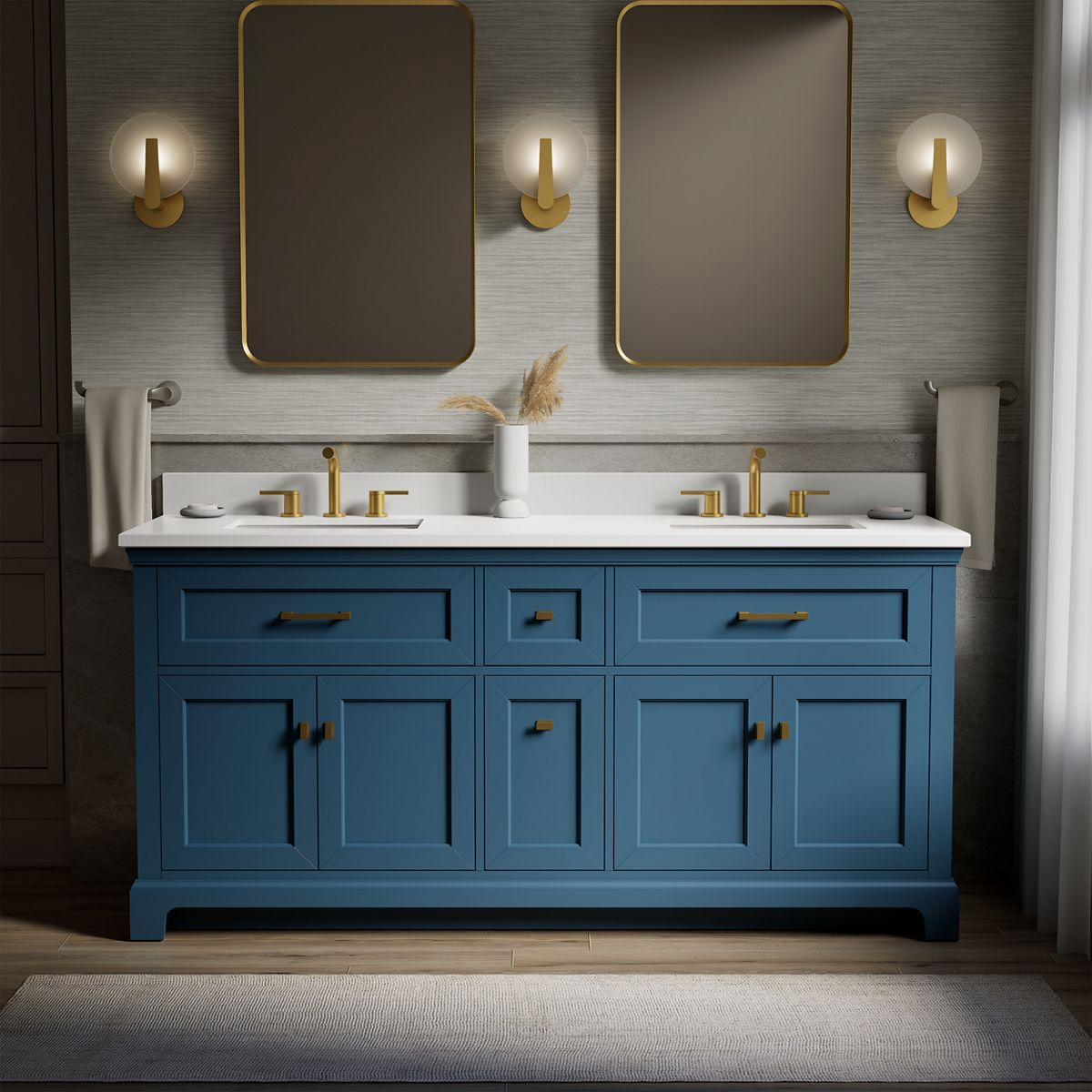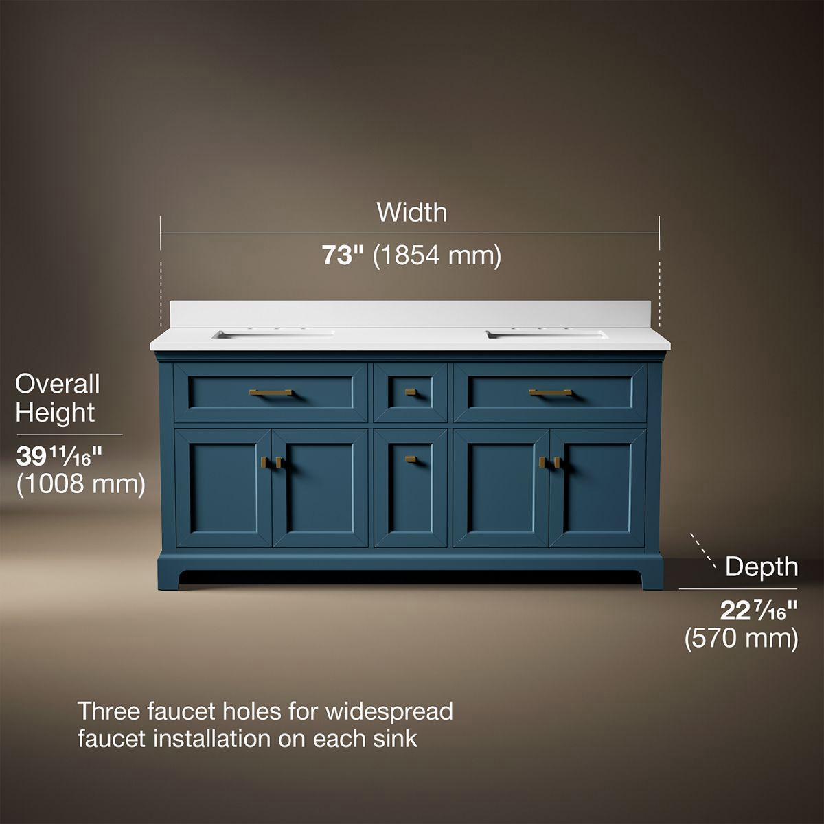 - Set includes cabinet, precut quartz vanity top, backsplash, sinks, cabinet hardware