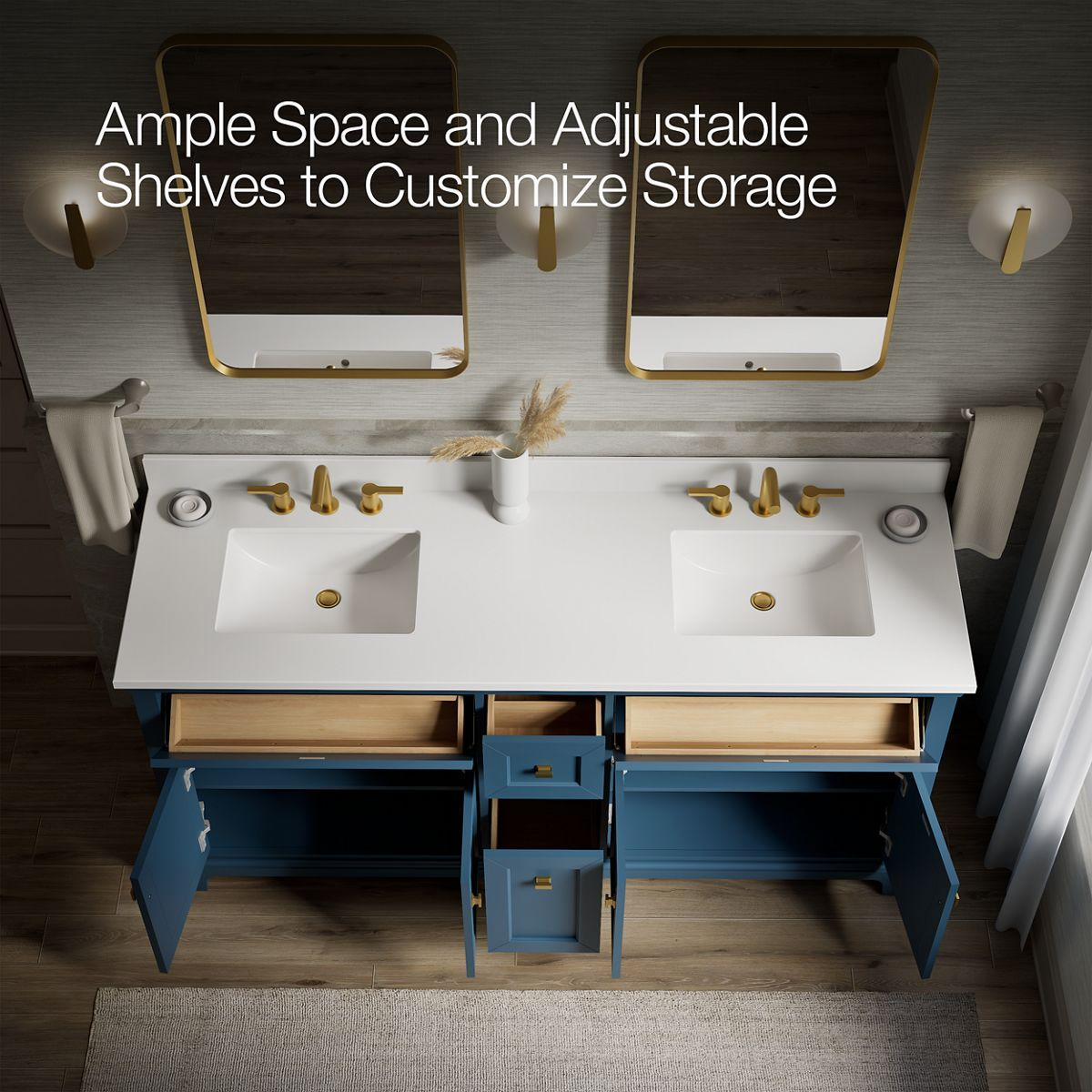 Inspired by midcentury modern design, the Charlemont vanity collection is adorned with elegant lines, subtle textures, and minimalist simplicity, bridging the gap between commonplace and niche. Raised-center door and drawer panels add visual interest, along with sharply squared hardware pulls featuring subtle details. This 72" vanity set includes cabinet, quartz countertop with matching backsplash, two sinks, and hardware.