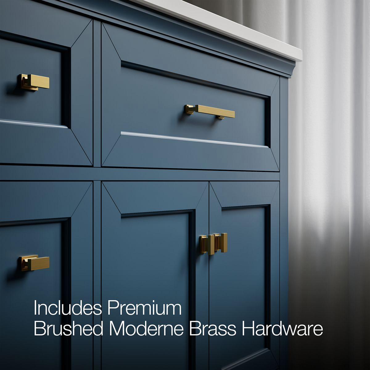 - Vibrant Brushed Nickel hardware included on White vanities, Vibrant Brushed Moderne Brass hardware on Ferrous Grey and Tidal Blue vanities, and Matte Black hardware on Light Oak vanities