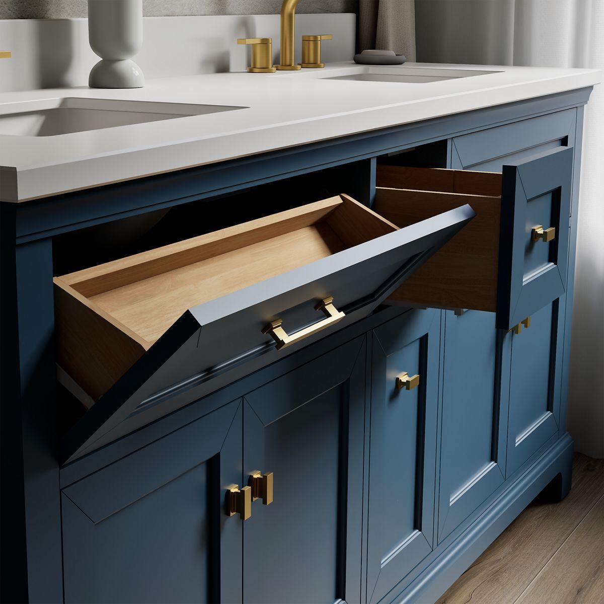 - Convenient tilt-down drawer under each basin for storing smaller, frequently-used items