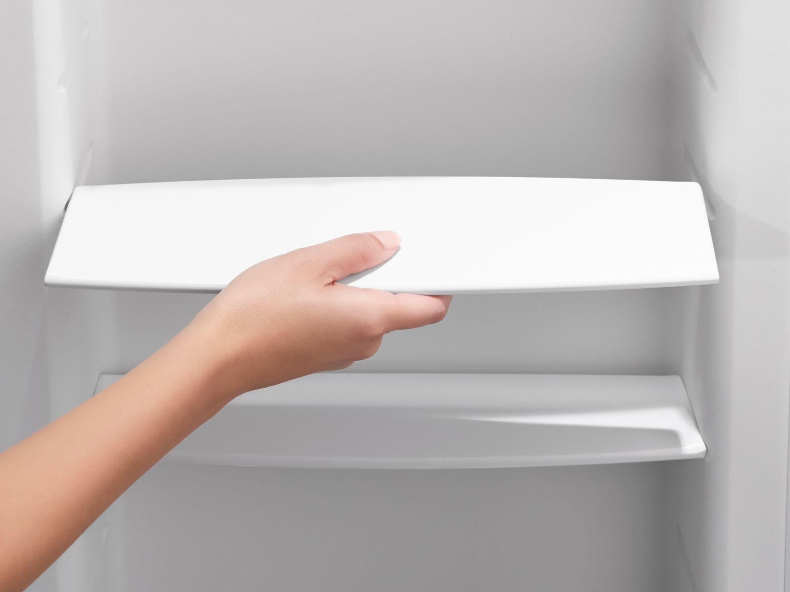 - One shelf includes a hook for hanging storage and a cup for toothbrushes or razors.