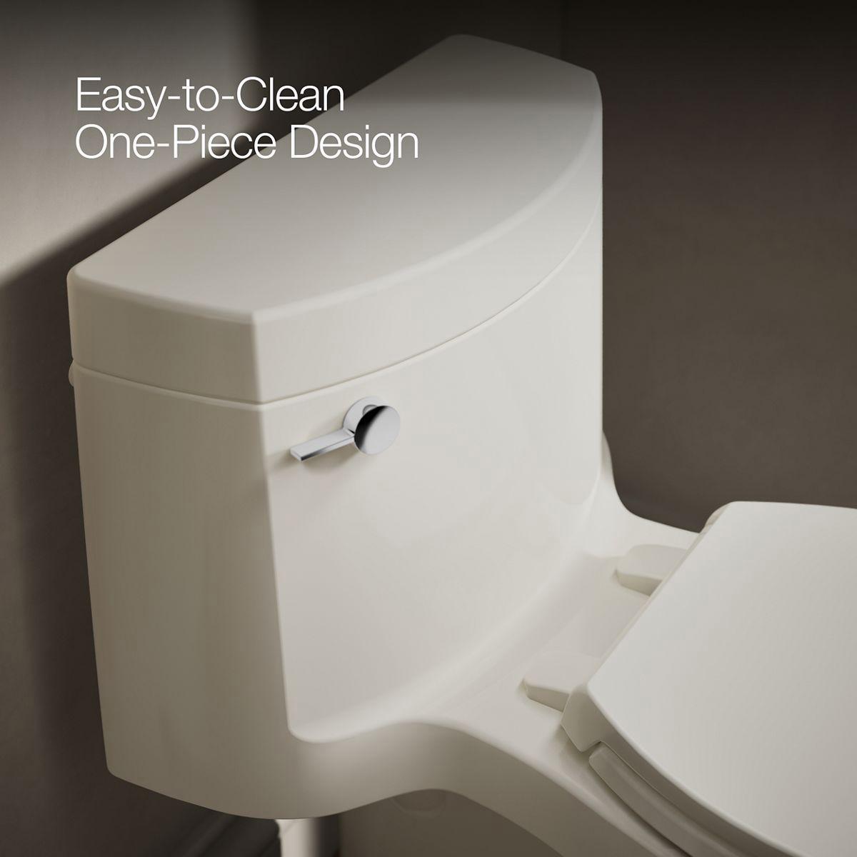 - One-piece toilets integrate the tank and bowl into a seamless, easy-to-clean design.