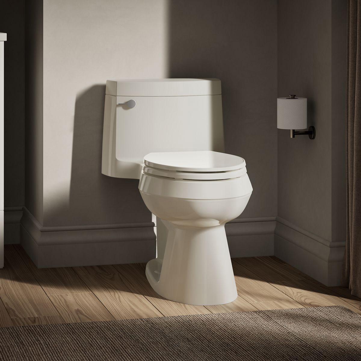 With its versatile, fresh design, the Cimarron toilet matches a range of contemporary and classic decors. This one-piece toilet features a convenient chair-like height and elongated bowl for comfortable use, as well as a concealed trapway for sleek looks and simple cleaning. A 1.28-gallon flush provides significant water savings of up to 16,500 gallons per year, compared to a 3.5-gallon toilet, without sacrificing performance. This toilet features innovative AquaPiston technology, a patented flush engine that delivers a fast, powerful, and virtually plug-free flush.