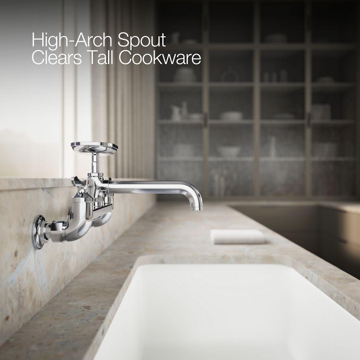 This Clearwater two-hole wall-mount bridge kitchen sink faucet offers a swing spout for easy clearance, two handles for positive control of hot and cold water, and a conveniently attached soap dish.