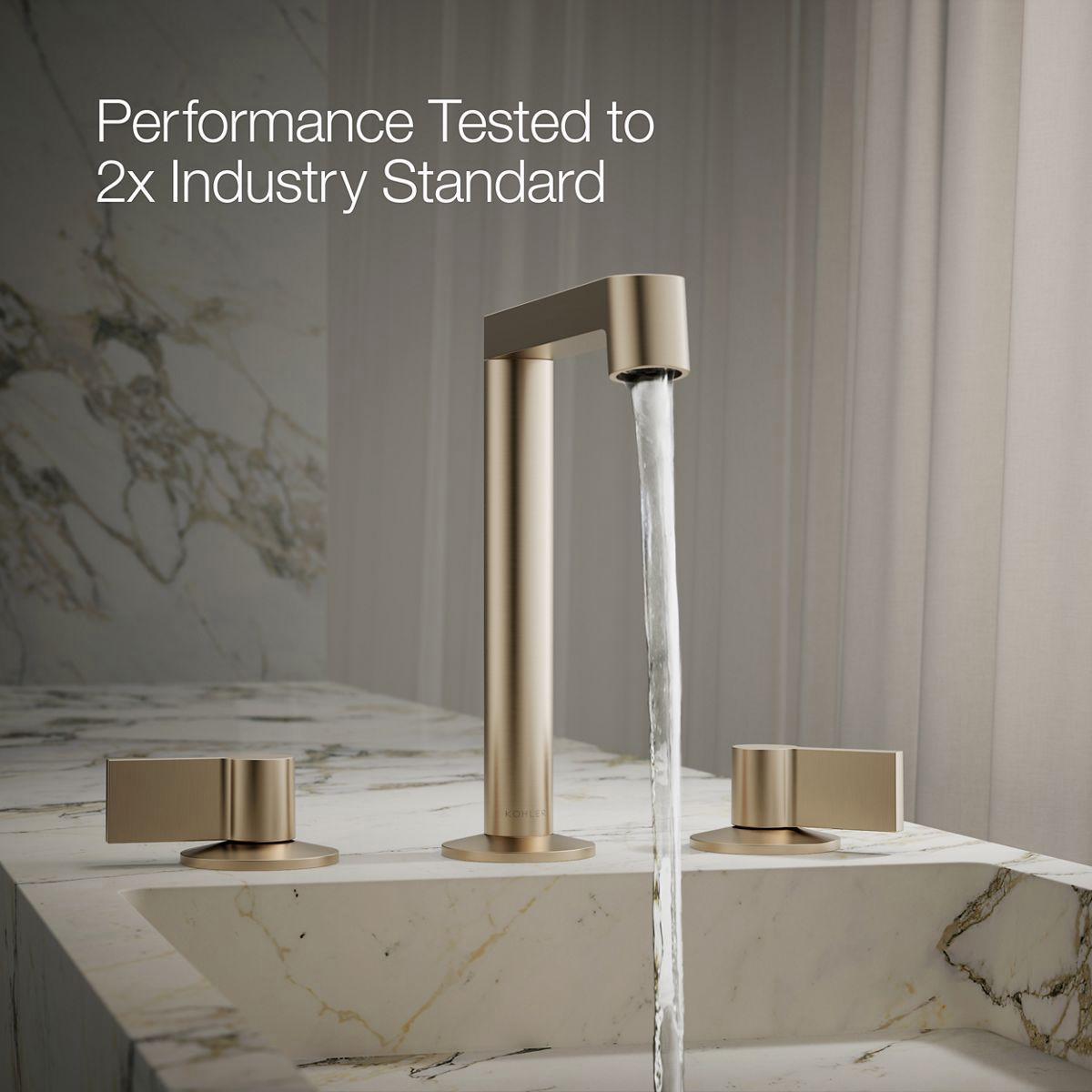 Modern form meets modern function: the KOHLER Components collection is defined by controlled forms and stark precision in every line and angle. With Components, you design your custom bath. Choose a spout, handles, and finish to build your own signature modern look. Displaying a monumental yet playful angularity, this Row spout pairs with your choice of Components sink handles for a personalized design.