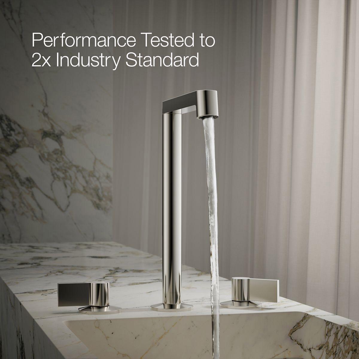 Modern form meets modern function: the KOHLER Components collection is defined by controlled forms and stark precision in every line and angle. With Components, you design your custom bath. Choose a spout, handles, and finish to build your own signature modern look. Displaying a monumental yet playful angularity, this Row spout features a tall height that complements vessel-style sinks. Pair it with your choice of Components sink handles for a personalized design.