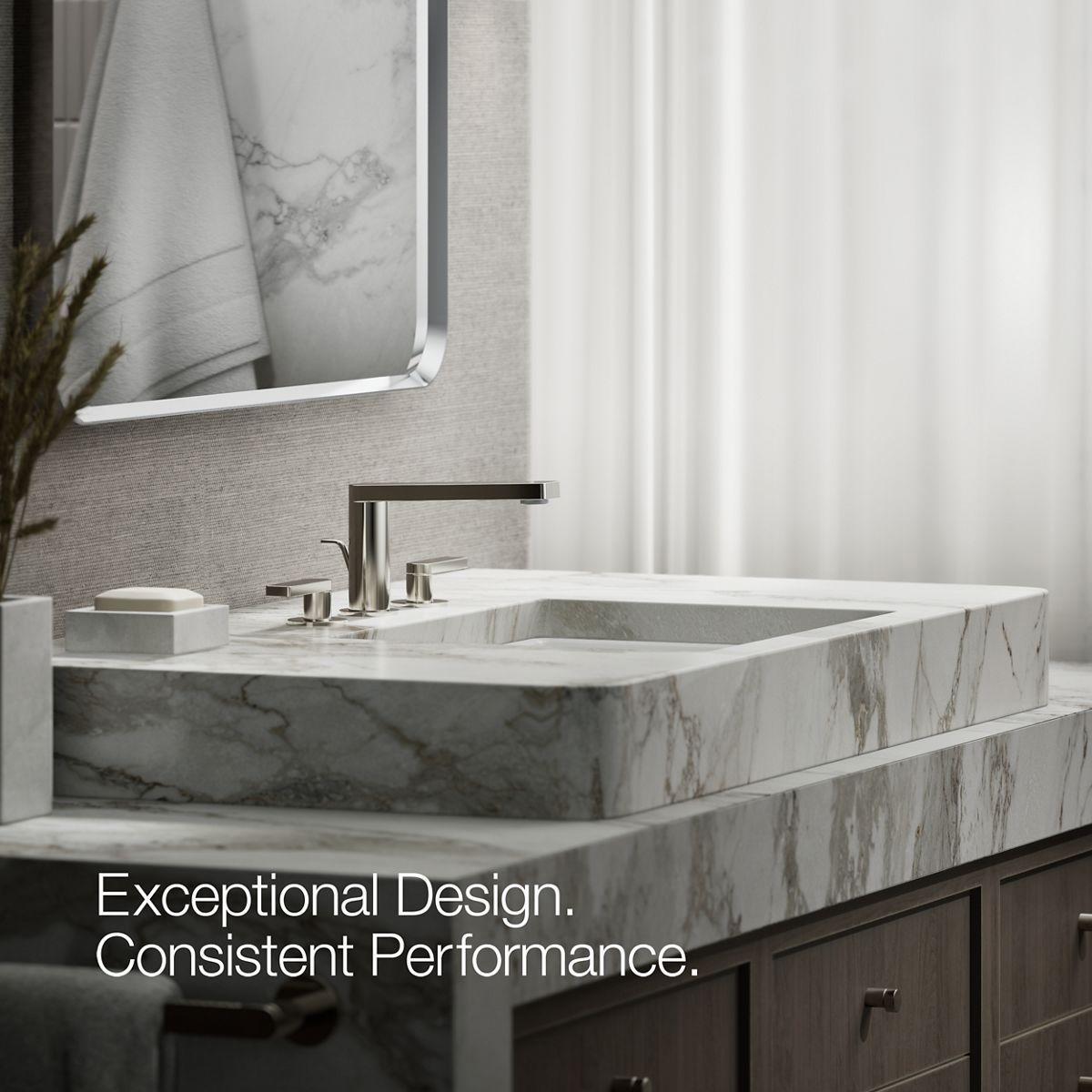 Timeless and deliberate, the Composed collection embodies the beautifully understated elements of minimalist design. By eliminating unnecessary details, the collection is designed to elicit an emotional response with its stark, refined beauty. This widespread faucet comes equipped with easy-to-install and leak-free UltraGlide valves.
