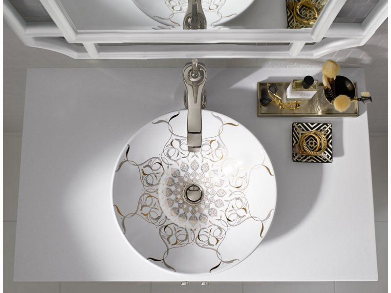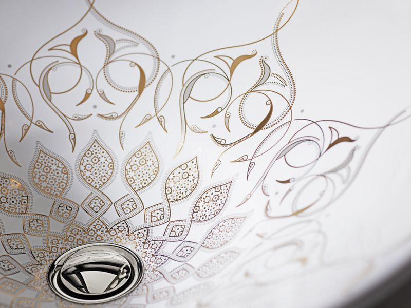 Decorative architecture and Moorish style define the distinctive Persia pattern. Striking open linework contrasts with geometric patterns, giving this Conical Bell sink its finely detailed look. A white background emphasizes the pattern yet is neutral enough to complement different fixture styles. This sink makes a dramatic, artistic statement.
