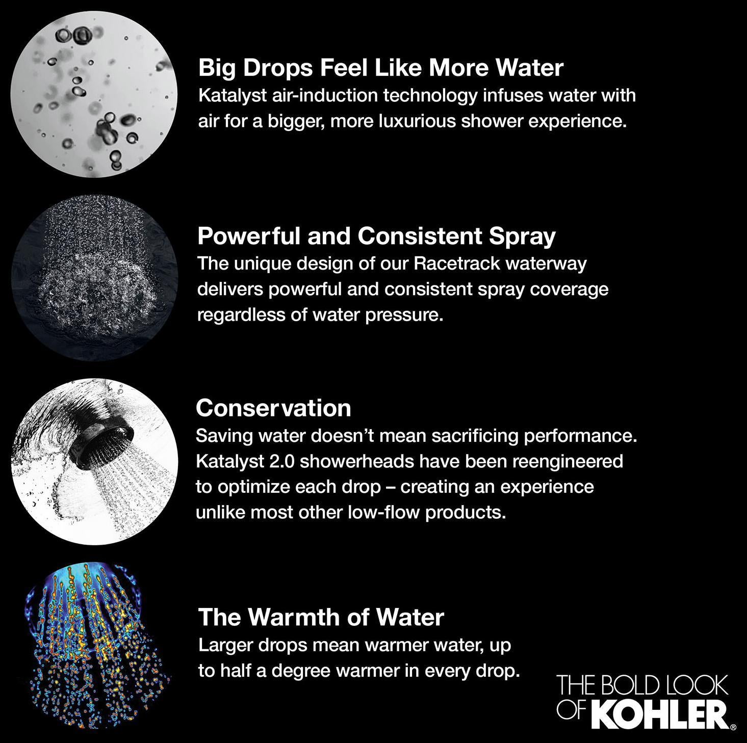 Enjoy a shower that simulates the soaking deluge of a warm summer downpour. This contemporary-style rainhead features innovative Katalyst air-induction technology, which efficiently mixes air and water to produce large water droplets and deliver a powerful, thoroughly drenching overhead shower experience. Its clean good looks and durable finish coordinate with many other KOHLER faucets and accessories.
