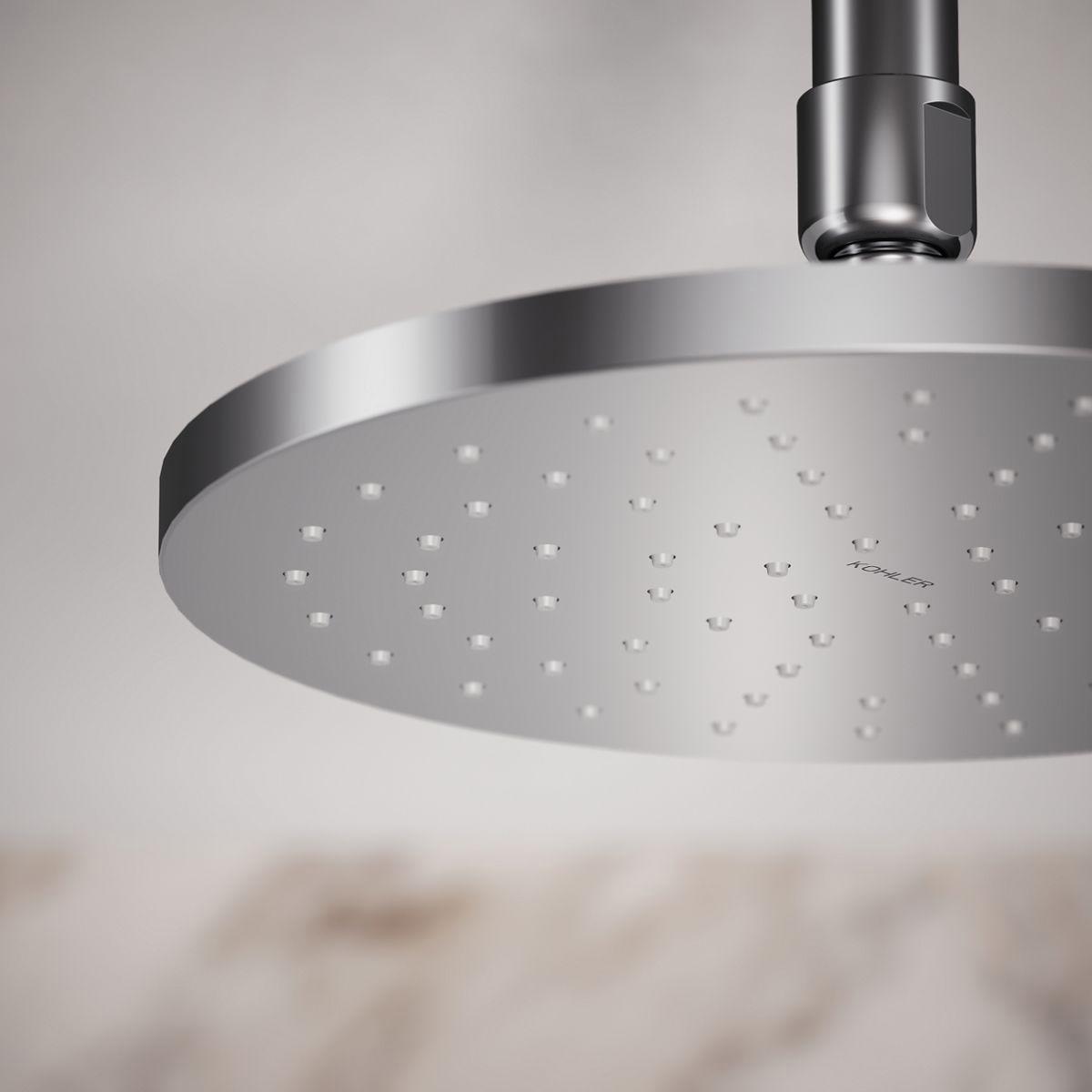 Enjoy a shower that simulates the soaking deluge of a warm summer downpour. This contemporary-style rainhead features innovative Katalyst air-induction technology, which efficiently mixes air and water to produce large water droplets and deliver a powerful, thoroughly drenching overhead shower experience. Its clean good looks and durable finish coordinate with many other KOHLER faucets and accessories.