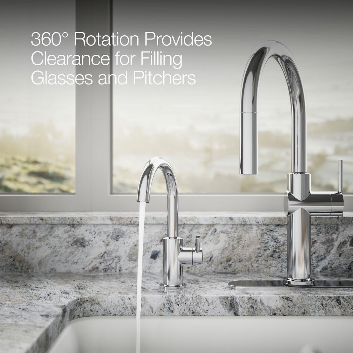 - Faucet spout rotates 360° and offers clearance for filling glasses and pitchers