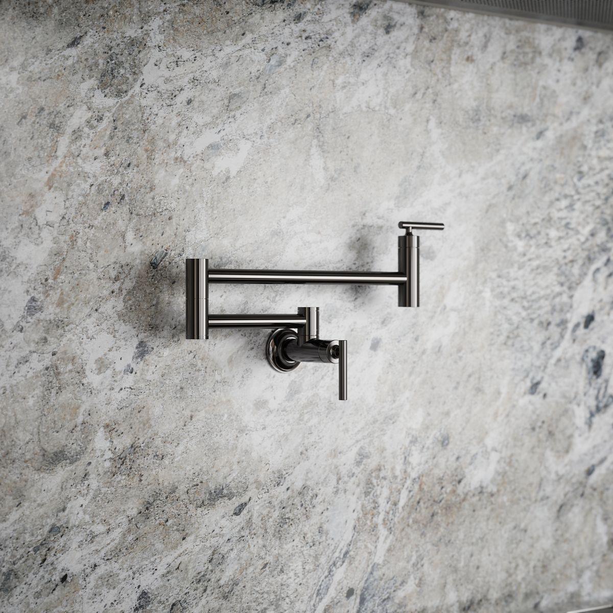 Imagine the practicality of a faucet that takes up no valuable counter space and can fold out of the way when not in use. Now imagine a faucet that can swing both to the left or right, extends to over 23” so that you can fill pots on or near your stove, and fills faster thanks to its robust 5.2 gpm flow rate. The wall-mount pot filler from KOHLER, with its clean, contemporary design, doesn’t overpower or detract from your kitchen design, but it will still create a stir.