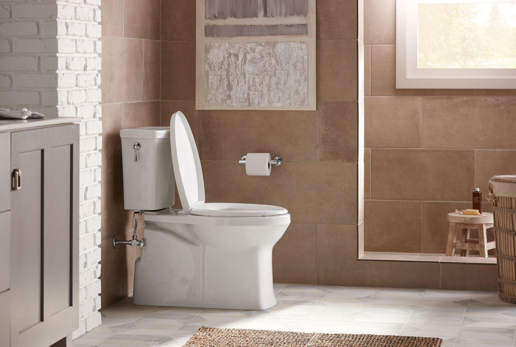 The Corbelle two-piece toilet delivers a powerful swirling flush in a sleek skirted design. Kohler's most complete flush ever, Revolution 360® flushing technology keeps your bowl cleaner longer than a conventional flush. Installation is easy with the ReadyLock™ system: the skirted trapway installs to the floor flange and attaches to the toilet, eliminating the need to drill holes while offering the same secure installation as nonskirted toilets. This WaterSense®-labeled high-efficiency toilet brings you annual water savings.