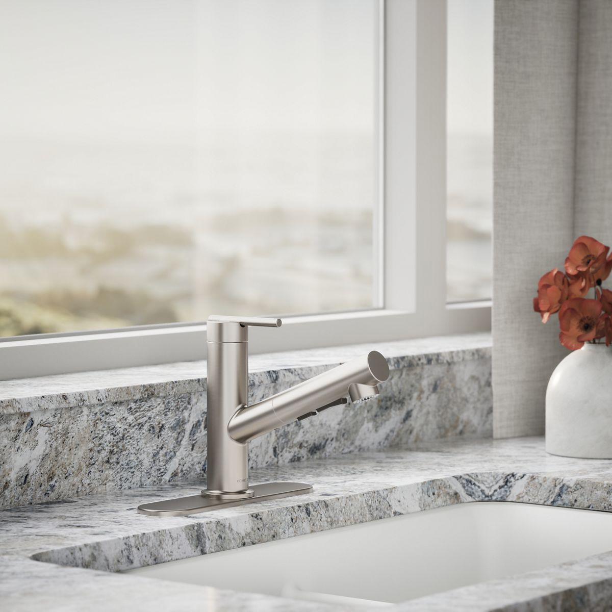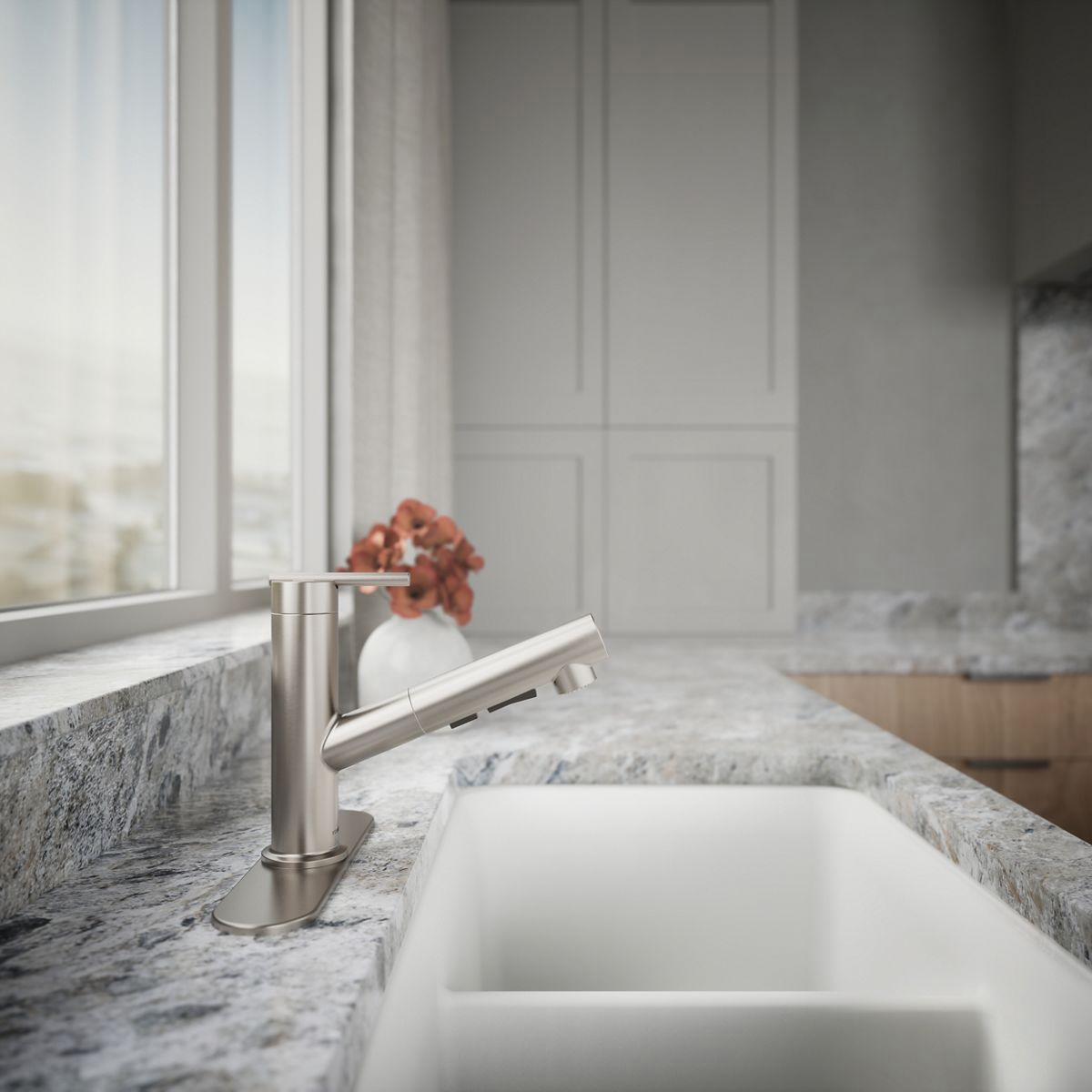 - Three-function pull-out sprayhead with touch control allows you to switch between stream, ring spray and Boost technology.