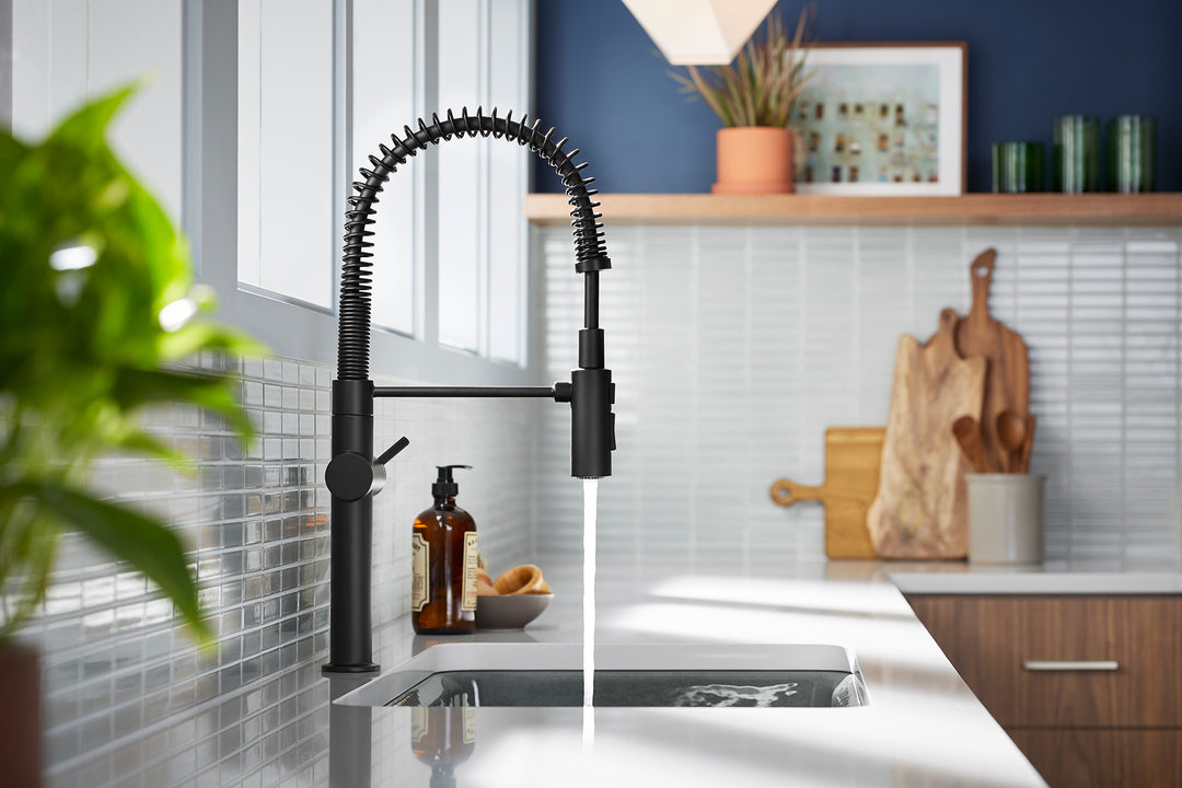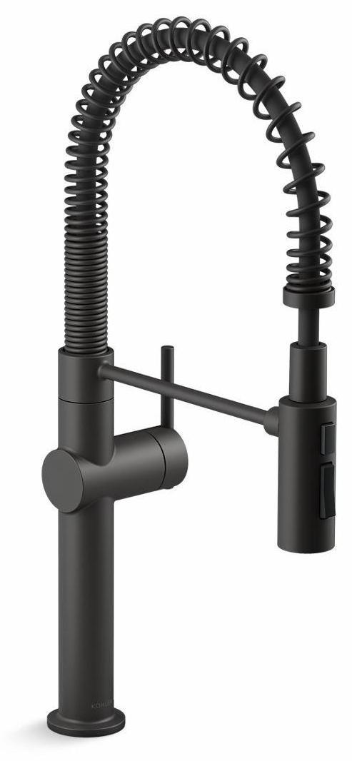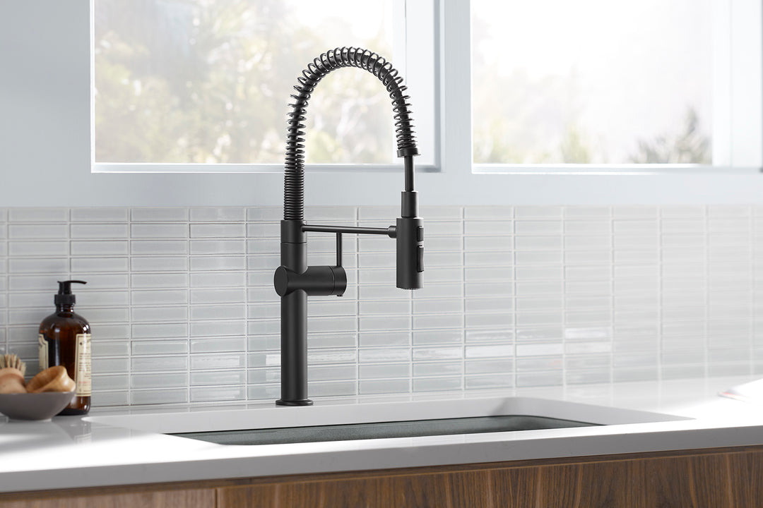 - Professional-style faucet with an easy-to-clean coated hose and removable coil.