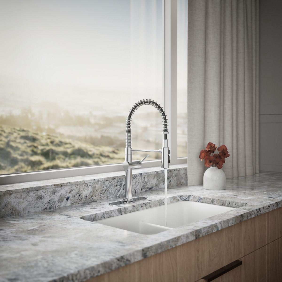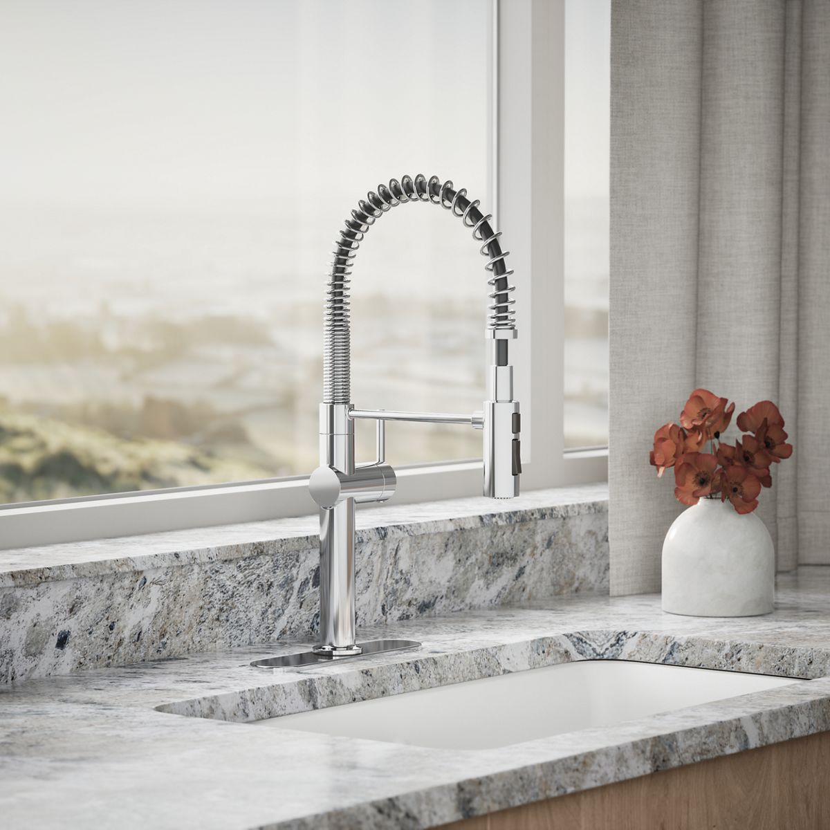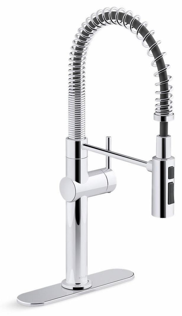 - Professional-style faucet with an easy-to-clean coated hose and removable coil.