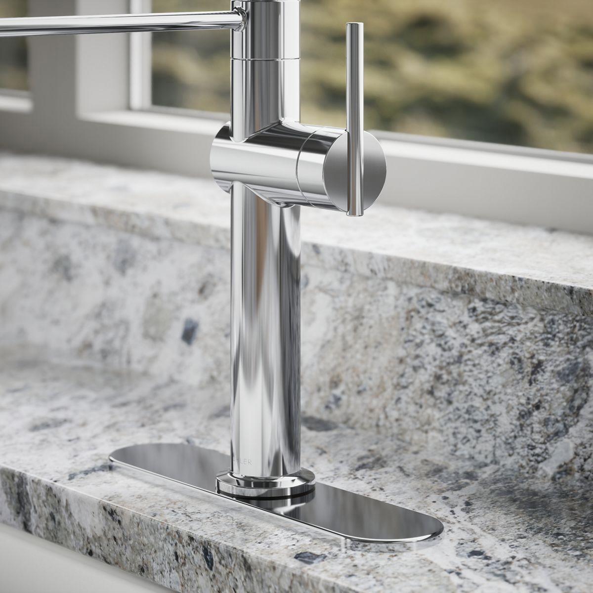 A model of clean, sophisticated design, the Crue kitchen faucet collection represents a true high point in user-focused plumbing design for the kitchen. The silhouette — a simple arched spout and single lever handle — offers a straightforward style that adapts to nearly any kitchen design. It’s this contemporary look, paired with thoughtful functionality, that makes the Crue collection a modern marvel.