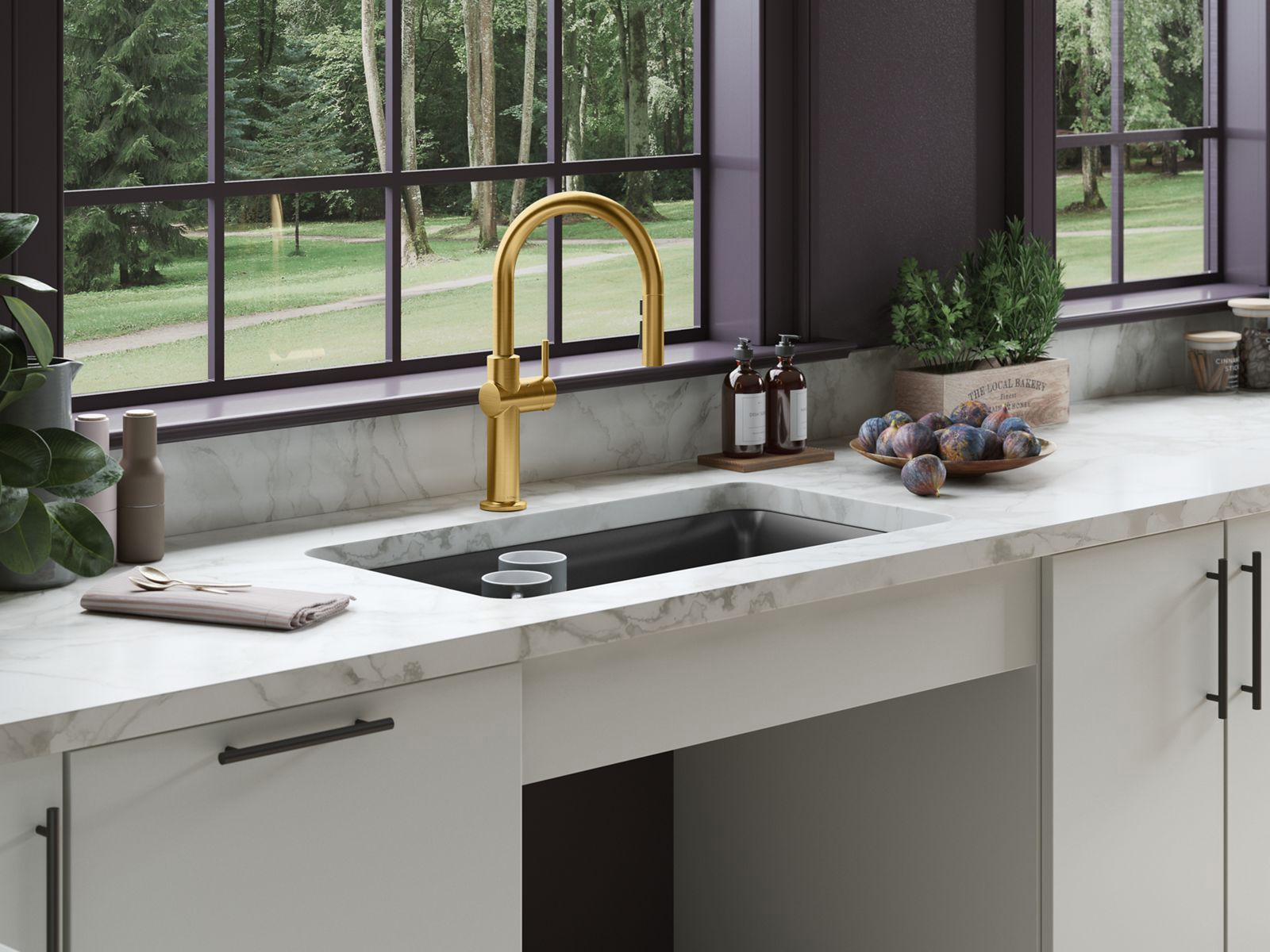 A model of clean, sophisticated design, the Crue kitchen faucet collection represents a true high point in user-focused plumbing design for the kitchen. The silhouette — a simple arched spout and single lever handle — offers a straightforward style that adapts to nearly any kitchen design. It’s this contemporary look, paired with thoughtful functionality, that makes the Crue collection a modern marvel.
