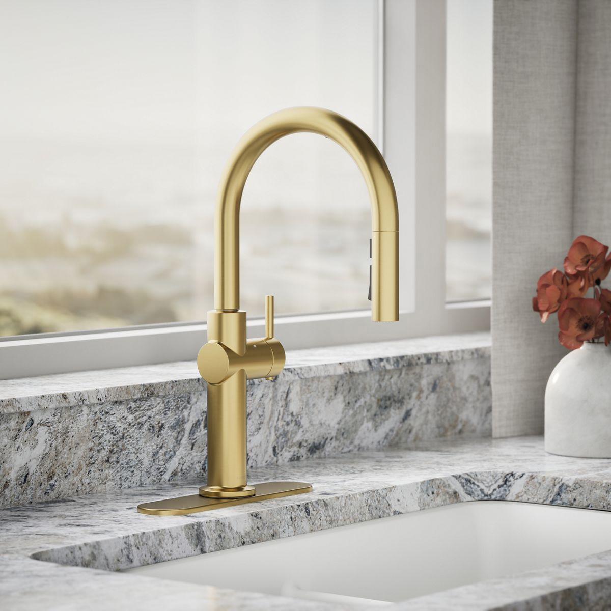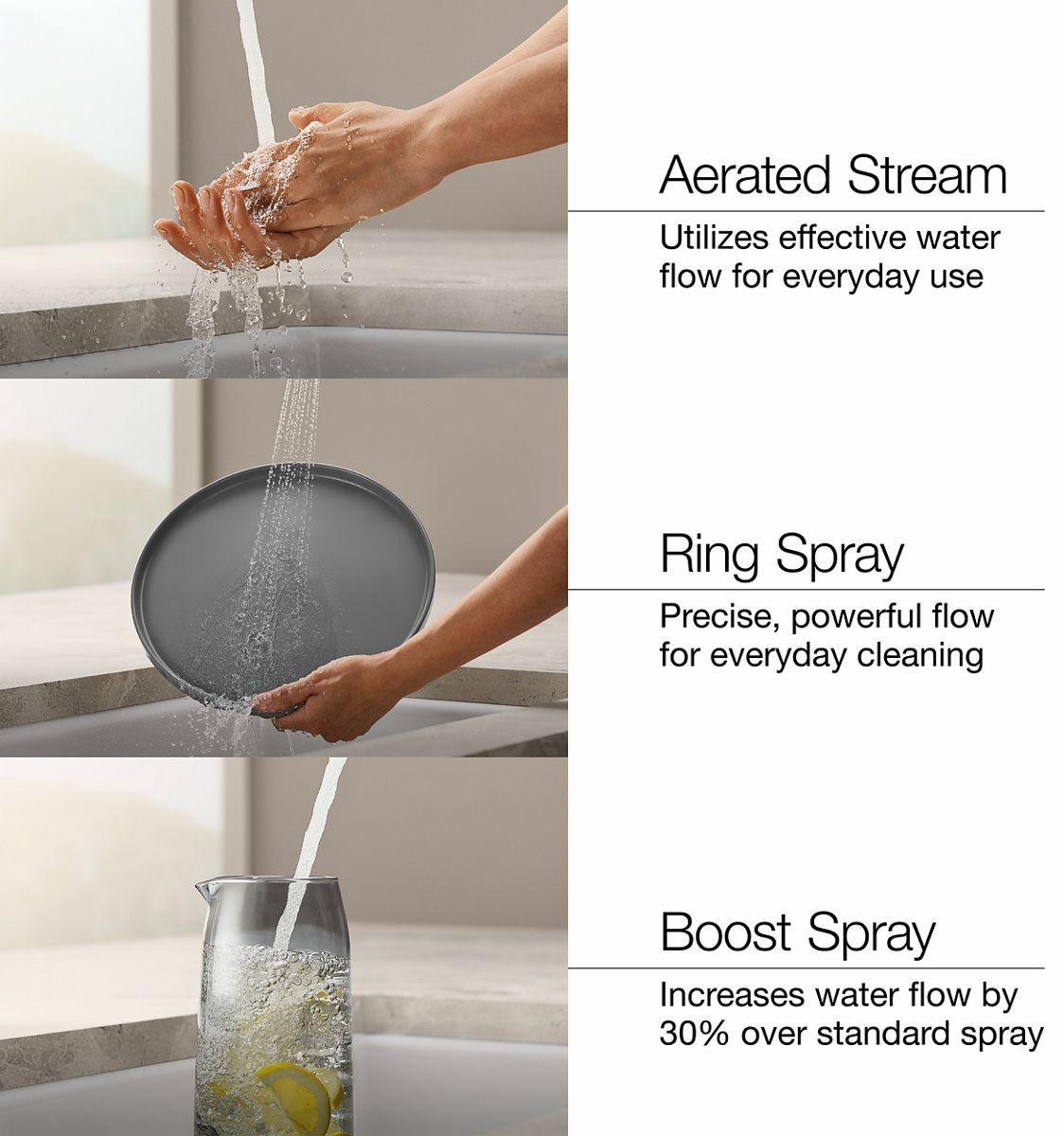 - Three-function pull-down sprayhead with touch control allows you to switch between aerated stream, ring spray and Boost technology.