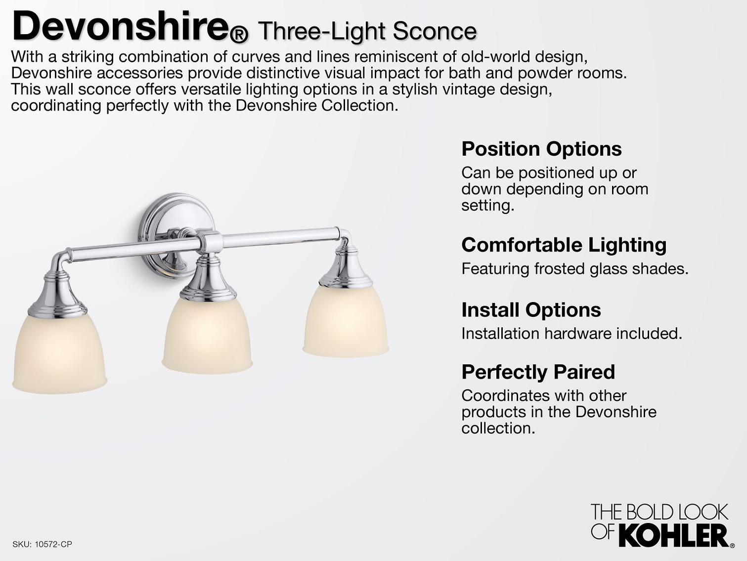 With a striking combination of curves and lines reminiscent of old-world design, Devonshire accessories provide distinctive visual impact for bath and powder rooms. This triple wall sconce offers versatile lighting options in a stylish vintage design, coordinating perfectly with the Devonshire Collection.