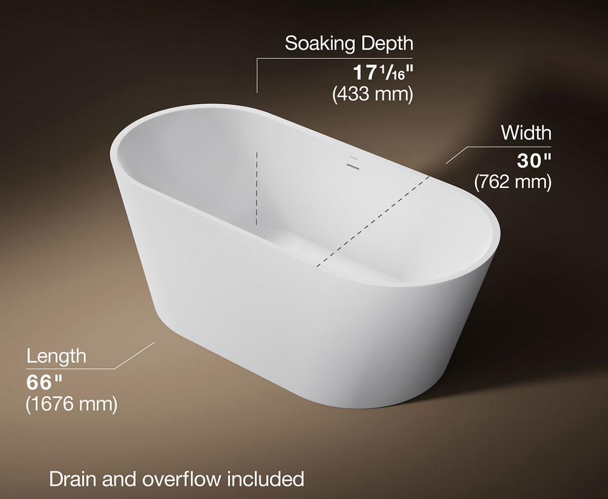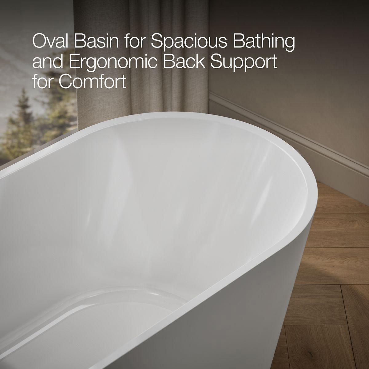 Clean, elegant, and contained, the Evok bath expresses contemporary warmth and simplicity. This Evok Oval freestanding bath lets you indulge in a deep, immersive soak as you relax against the sloped lumbar support. The sleek, one-piece seamless acrylic construction offers exceptional durability, with thoughtful touches like built-in integral overflow, toe-tap drain, and location versatility.