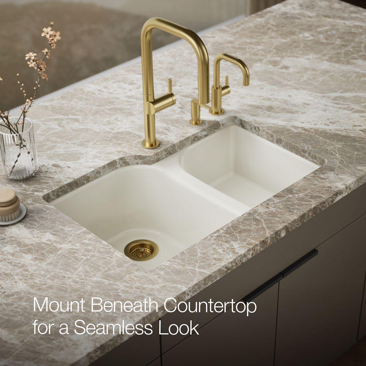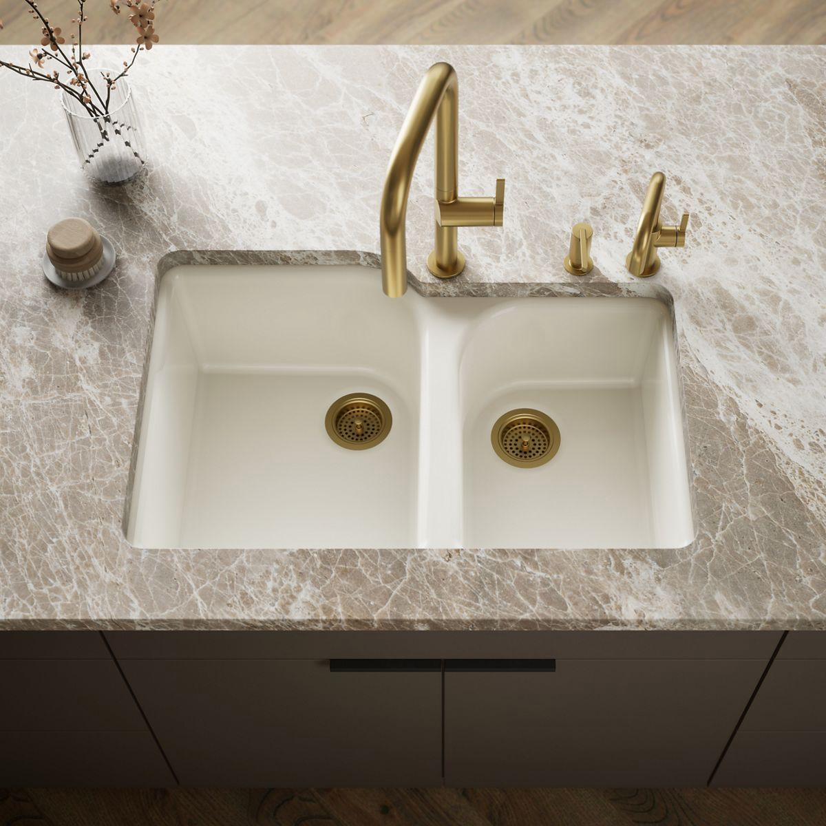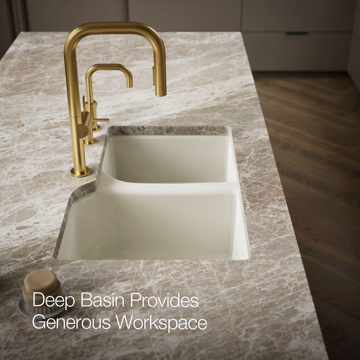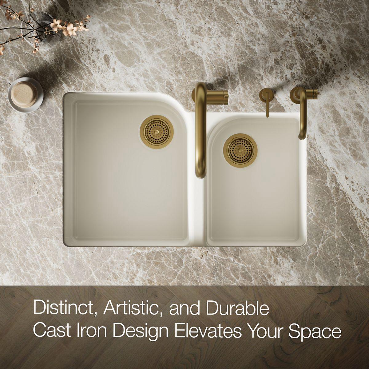 Handle kitchen tasks like a pro with the Executive Chef sink, featuring an innovative offset faucet ledge to maximize basin space. The large/medium bowls allow you to keep clean and dirty dishes separate while offering plenty of room for oversize pots and pans. Crafted from enameled cast iron, this sink resists chipping, cracking, or burning for years of beauty and reliable performance.