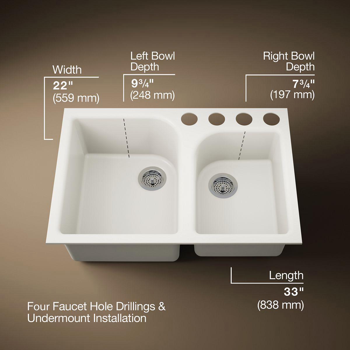 - 9-3/4" depth left bowl and 7-3/4" depth right bowl.