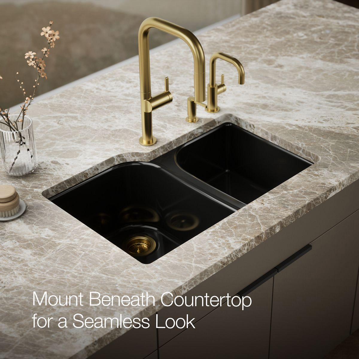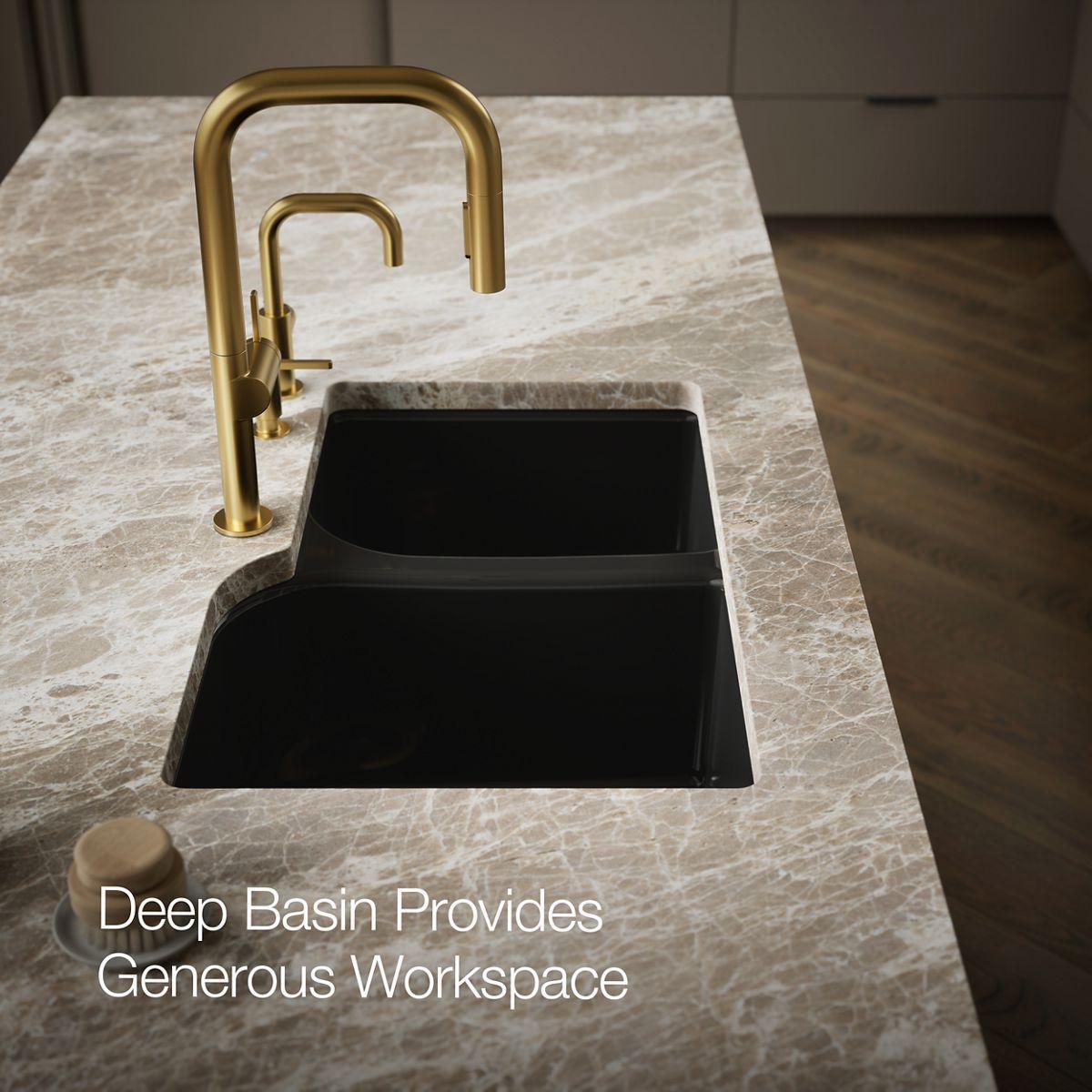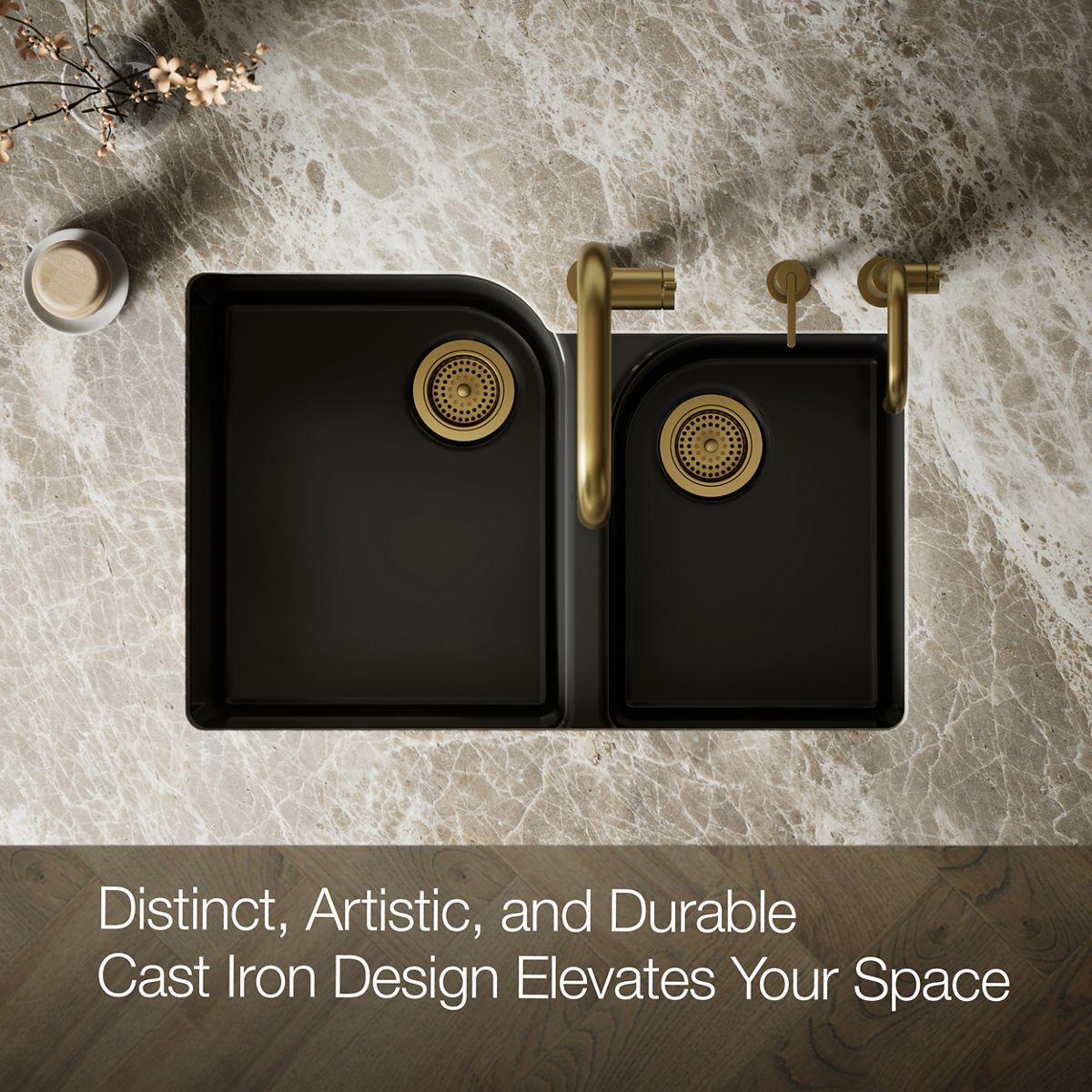 Handle kitchen tasks like a pro with the Executive Chef sink, featuring an innovative offset faucet ledge to maximize basin space. The large/medium bowls allow you to keep clean and dirty dishes separate while offering plenty of room for oversize pots and pans. Crafted from enameled cast iron, this sink resists chipping, cracking, or burning for years of beauty and reliable performance.
