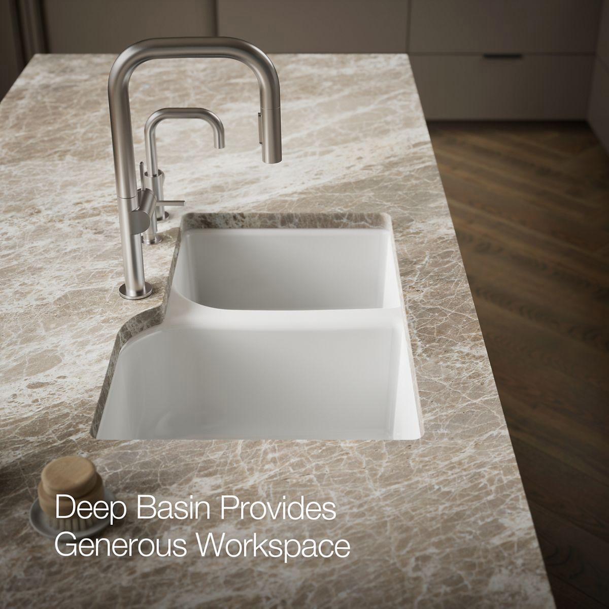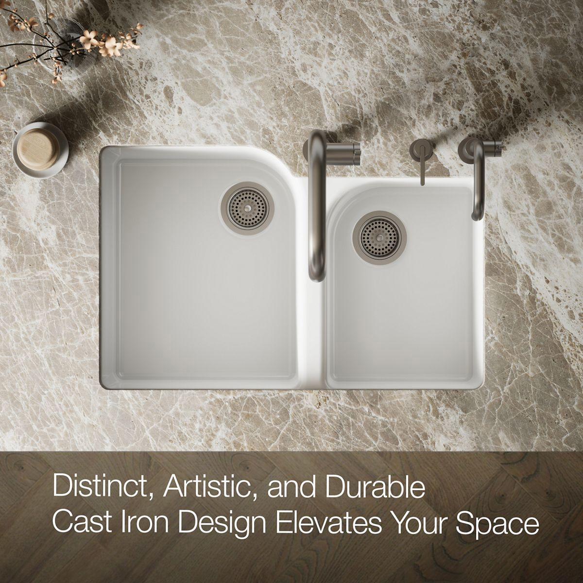 Handle kitchen tasks like a pro with the Executive Chef sink, featuring an innovative offset faucet ledge to maximize basin space. The large/medium bowls allow you to keep clean and dirty dishes separate while offering plenty of room for oversize pots and pans. Crafted from enameled cast iron, this sink resists chipping, cracking, or burning for years of beauty and reliable performance.