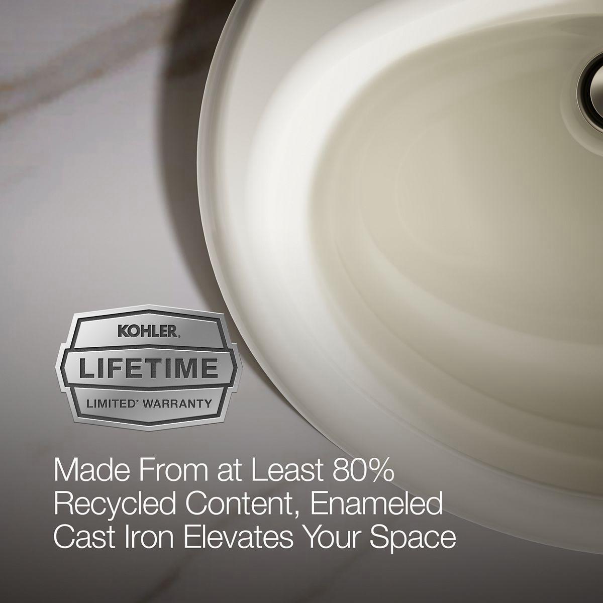 A classic beauty, the Farmington features an oval-shaped basin with pleasing lines. The durable cast iron sink features an ultra-thick, high-gloss enamel finish that resists staining, scratching, and chipping to maintain a lustrous sheen over time.