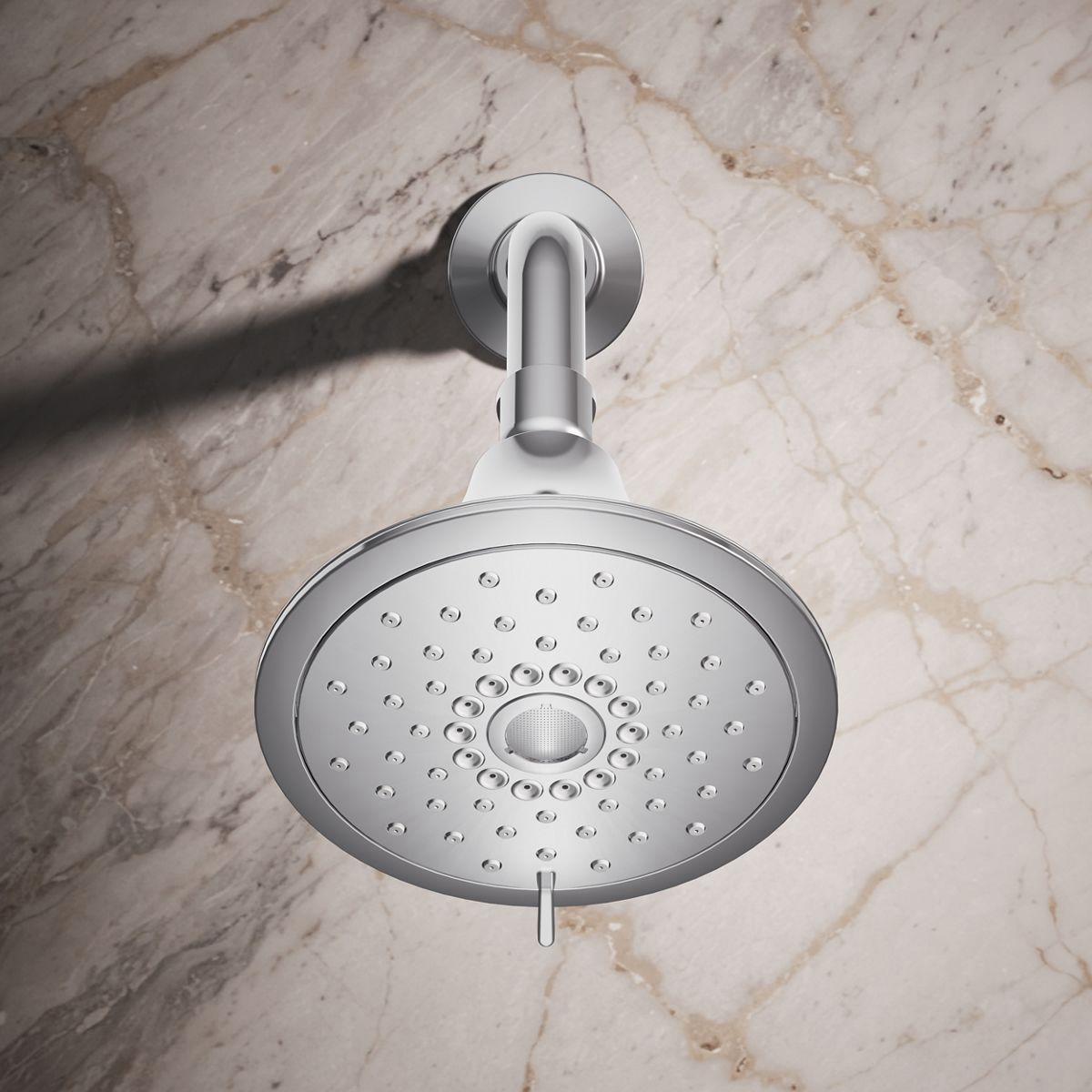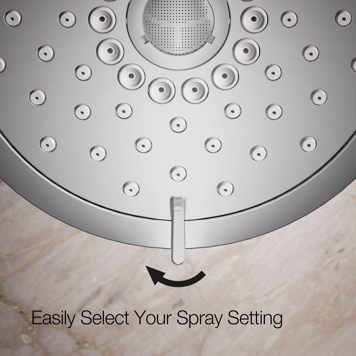 - Multifunction showerhead and handshower each have advanced spray engines to provide three experiences: full coverage, pulsating massage, and silk spray.