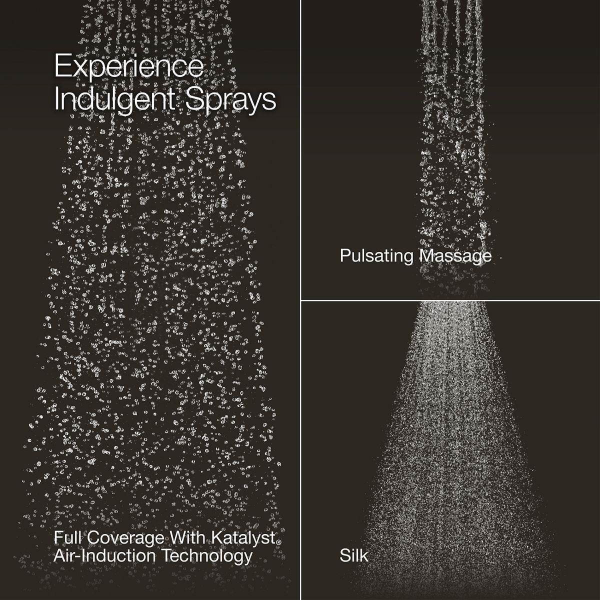 - Multifunction showerhead and handshower each have advanced spray engines to provide three experiences: full coverage, pulsating massage, and silk spray.