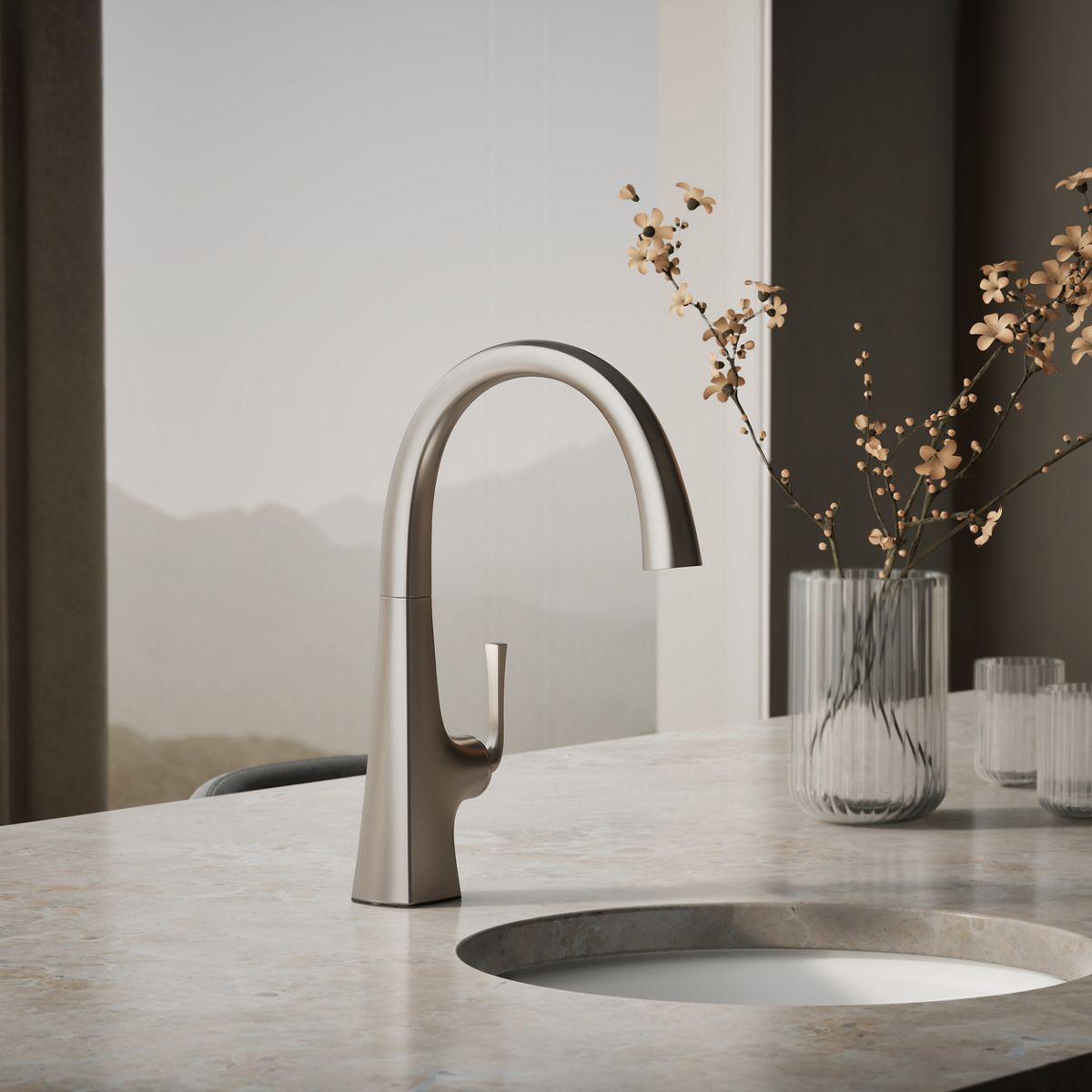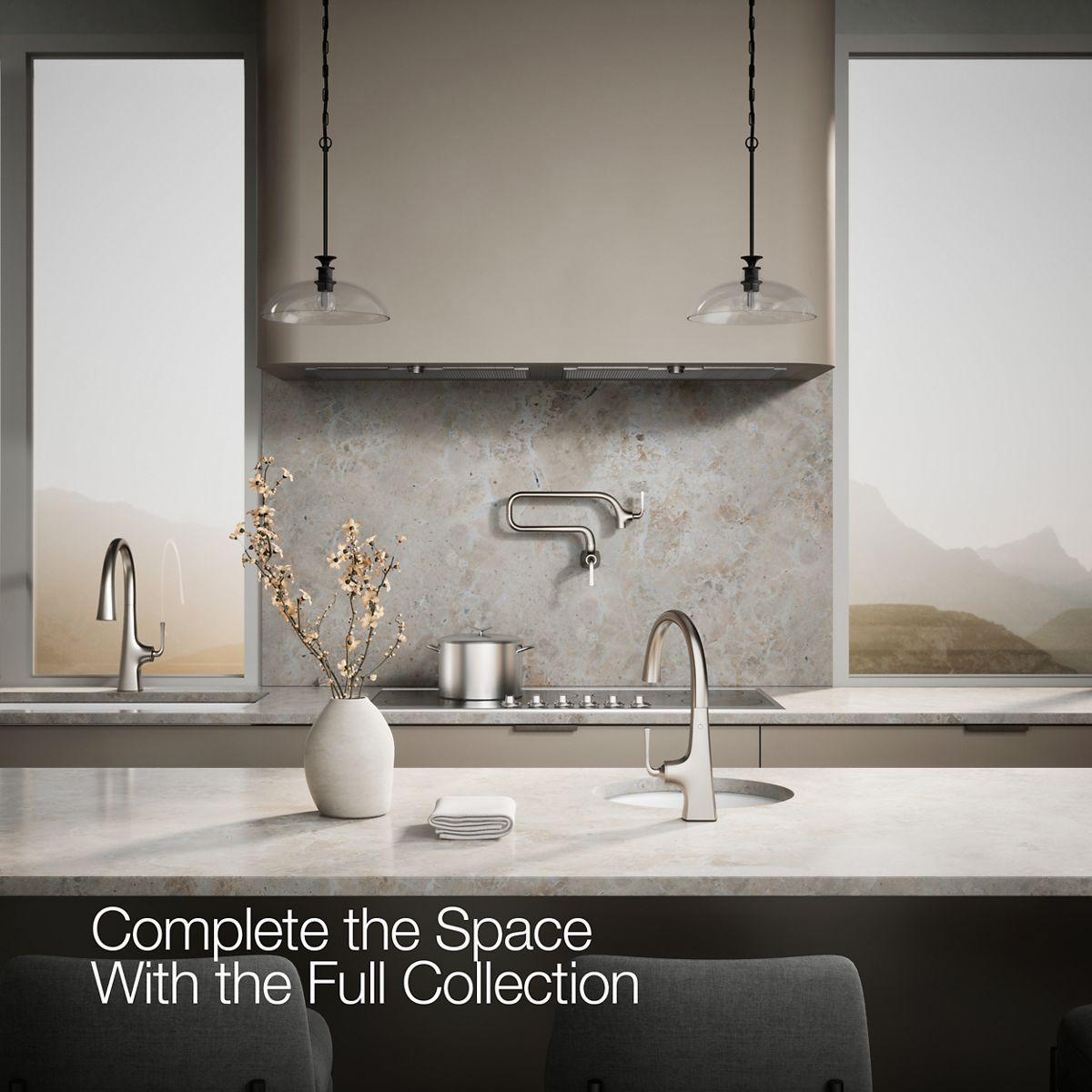 - High-arch swing spout with 155˚ rotation offers superior clearance for filling pitchers, chilling bottles and cleanup