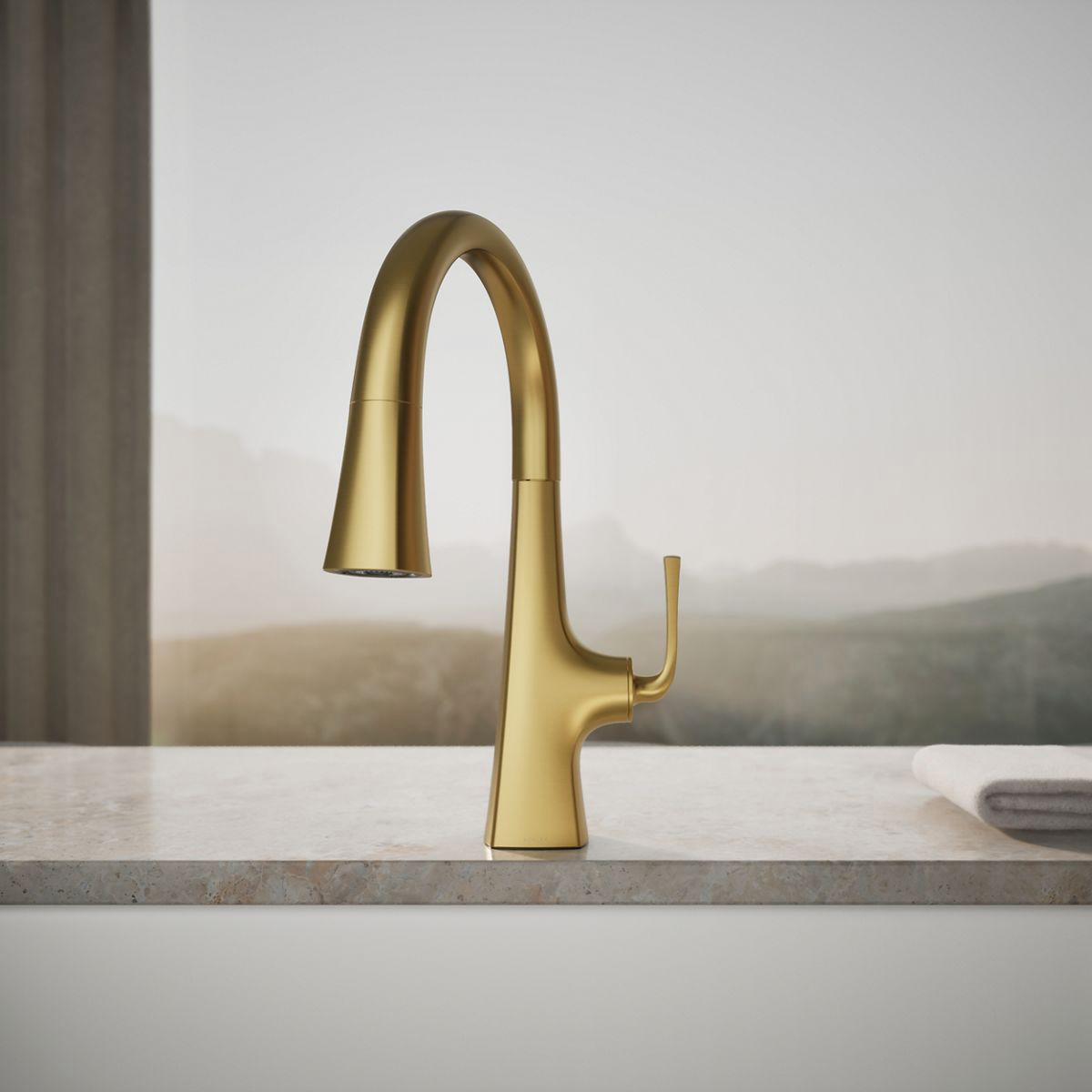 - Three-function pull-down sprayhead with touch-control allows you to switch between stream, Sweep® spray and BerrySoft® spray