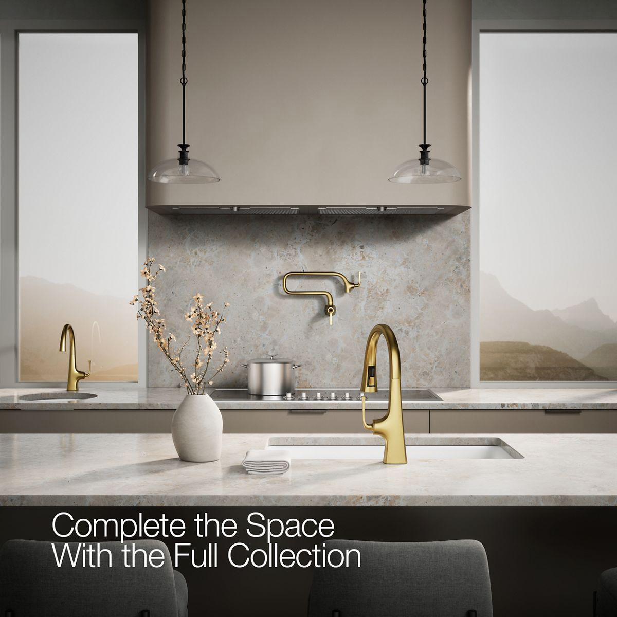 - High-arch 270-degree rotating swing spout offers vertical clearance for tall cookware and pitchers.