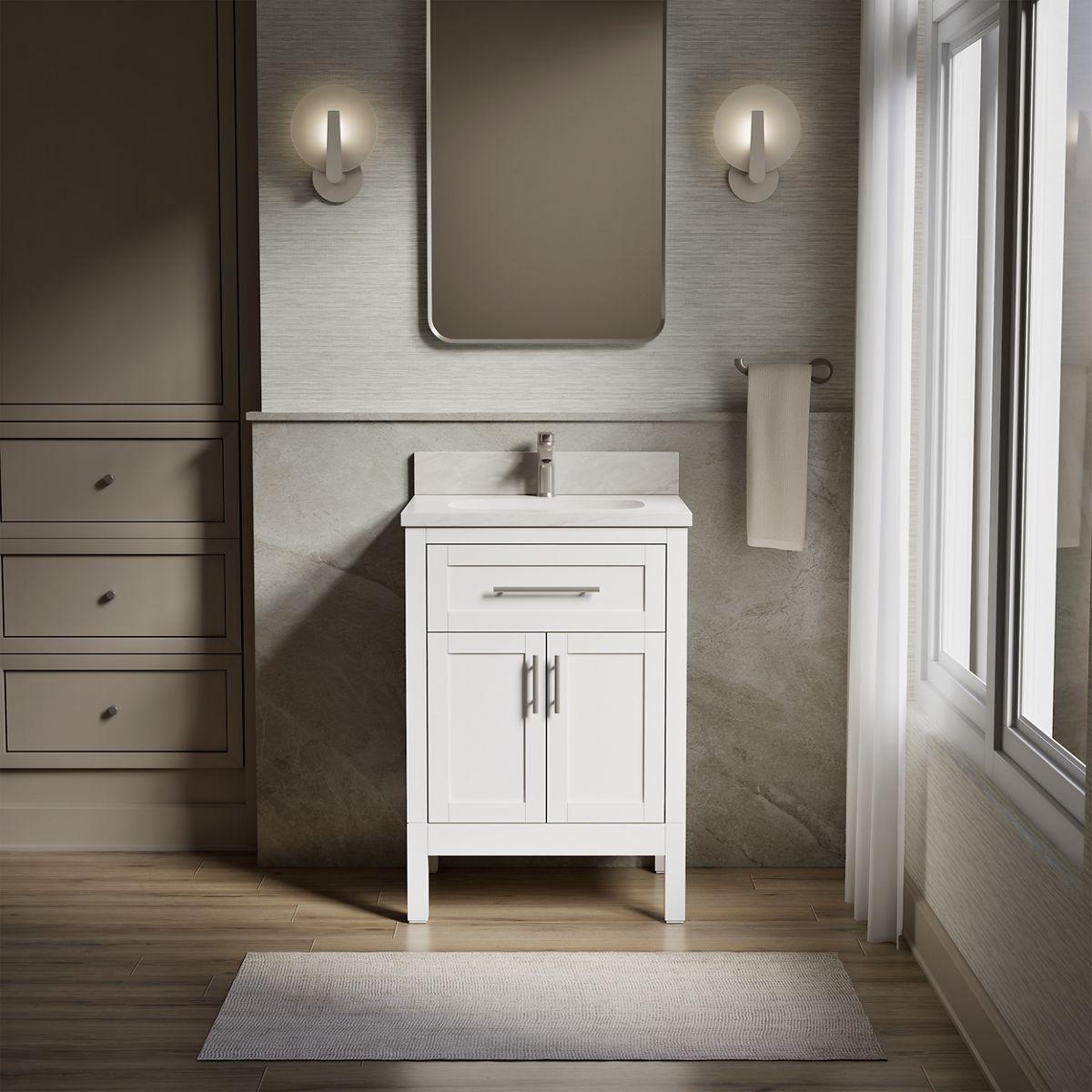 In typical Shaker style, the Hadron bathroom vanity set is a classic. Its modest, clean design doesn’t overpower your bathroom — it blends into it — lending itself to many decorating styles. The Hadron vanity set includes cabinet, quartz countertop, sink, and Vibrant Brushed Nickel hardware. Pair with any KOHLER single-handle bathroom sink faucet for your own unique touch.
